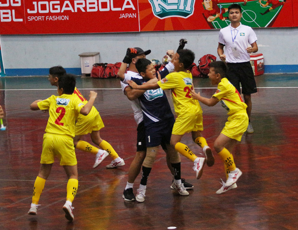 Niềm vui chiến thắng của các cầu thủ nhí SLNA khi vượt qua U11 PVF ở lượt đá luân lưu
