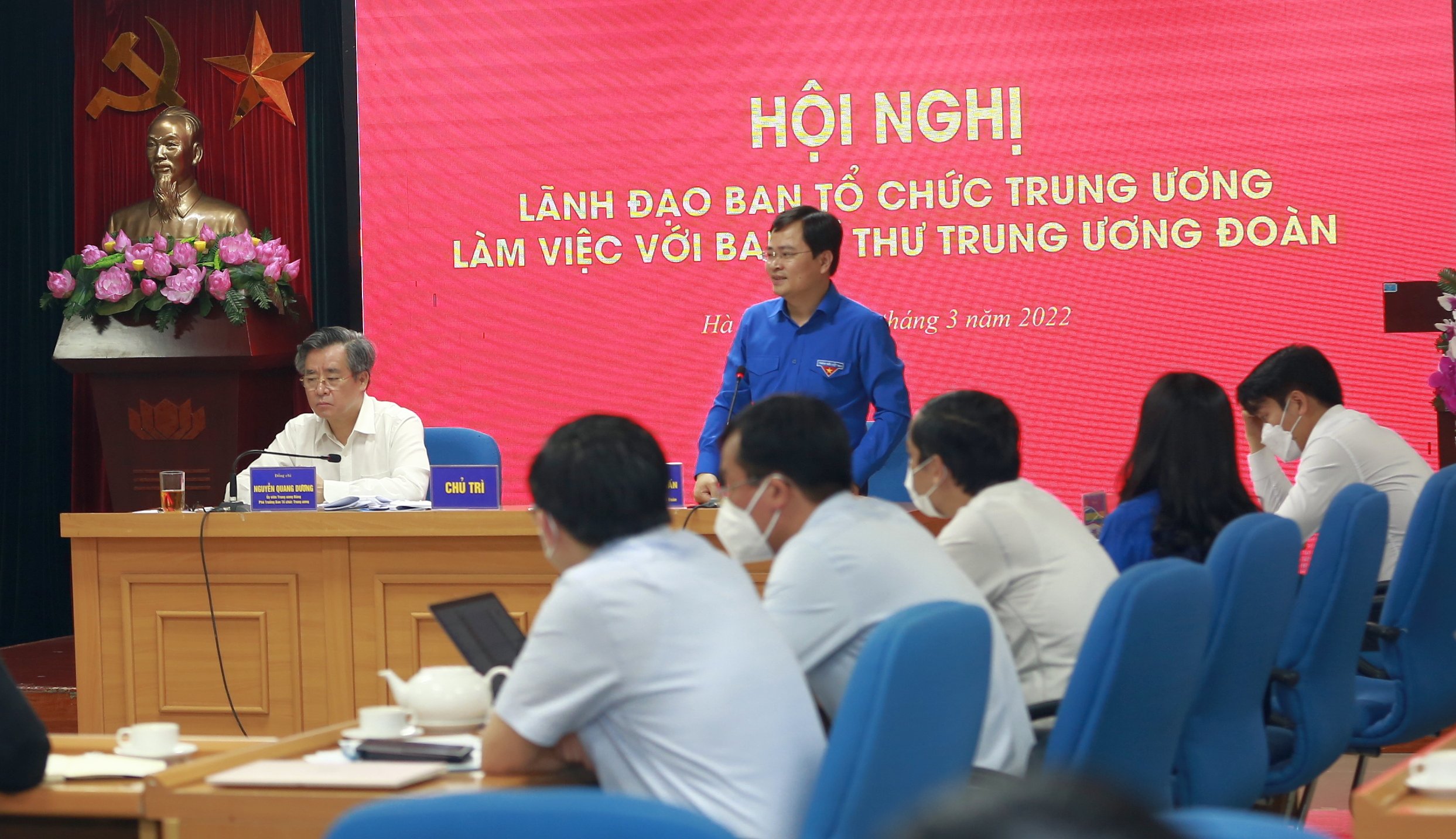 Đồng chí Nguyễn Quang Dương - Ủy viên T.Ư Đảng, Phó Trưởng Ban Tổ chức T.Ư; đồng chí Nguyễn Anh Tuấn - Ủy viên T.Ư Đảng, Bí thư thứ nhất T.Ư Đoàn dự và chủ trì hội nghị. Tham dự hội nghị còn có các đồng chí Nguyễn Ngọc Lương - Bí thư T.Ư Đoàn, Chủ tịch Hội LHTN Việt Nam; đồng chí Nguyễn Tường Lâm - Bí thư T.Ư Đoàn; đồng chí Nguyễn Phạm Duy Trang - Bí thư T.Ư Đoàn, Chủ tịch Hội đồng Đội T.Ư; cùng đại diện lãnh đạo các vụ chức năng Ban Tổ chức Trung ương; lãnh đạo các ban, đơn vị T.Ư Đoàn.