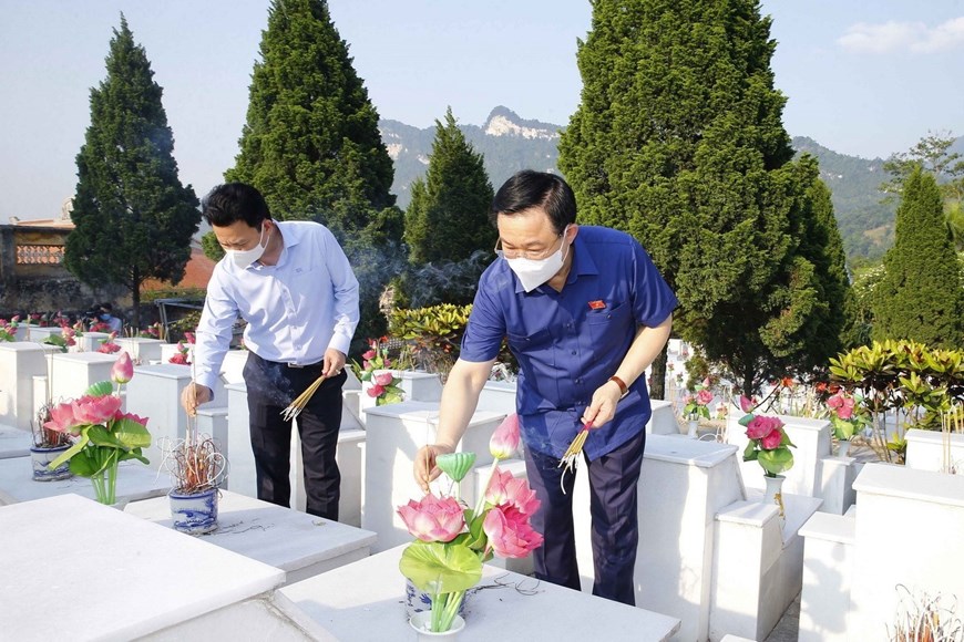 Chủ tịch Quốc hội Vương Đình Huệ thắp hương viếng các Anh hùng liệt sỹ tại Nghĩa trang liệt sỹ Quốc gia Vị Xuyên (Hà Giang), ngày 5/5/2021. (Ảnh: Doãn Tấn/TTXVN)