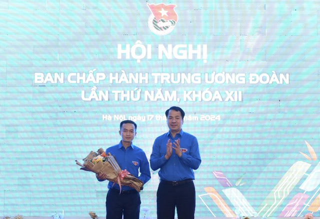 Đồng chí Ngô Văn Cương tặng hoa chúc mừng đồng chí được bầu bổ sung vào Ủy ban Kiểm tra Trung ương Đoàn khóa XII.