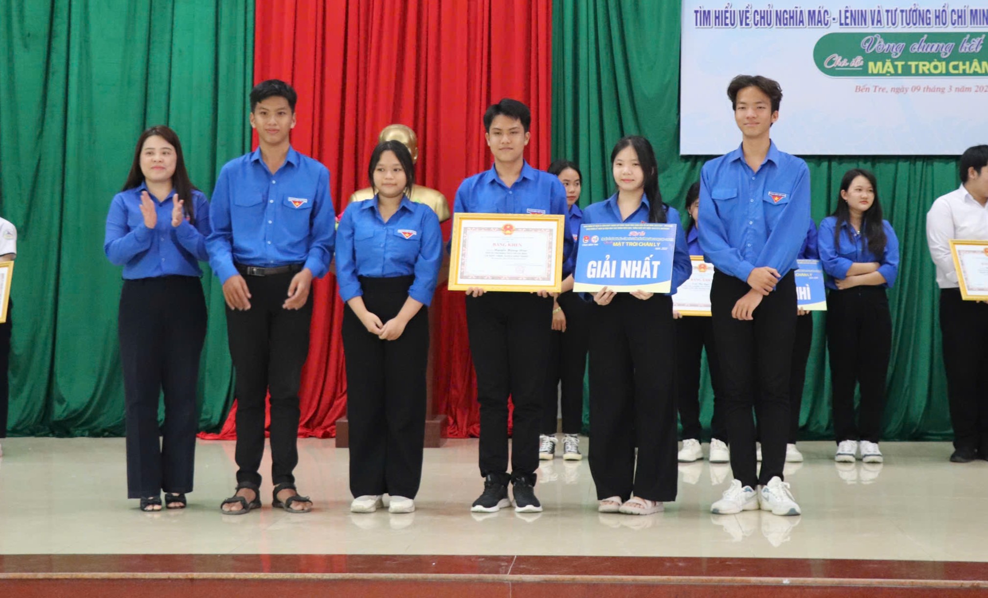 Đồng chí Võ Thị Phương Diệu, Phó Bí thư Tỉnh đoàn, Chủ tịch Hội đồng Đội tỉnh trao giải Nhất dành cho đội dự thi đơn vị huyện Chợ Lách