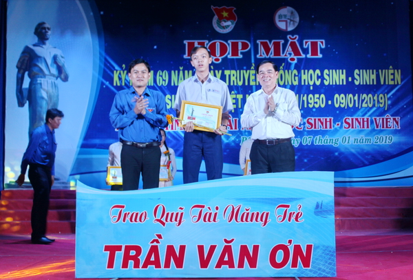 Đồng chí Trần Ngọc Tam - Phó Bí thư Tỉnh ủy, đồng chí Hà Quốc Cường - Bí thư Tỉnh đoàn trao quỹ tài năng trẻ Trần Văn Ơn |