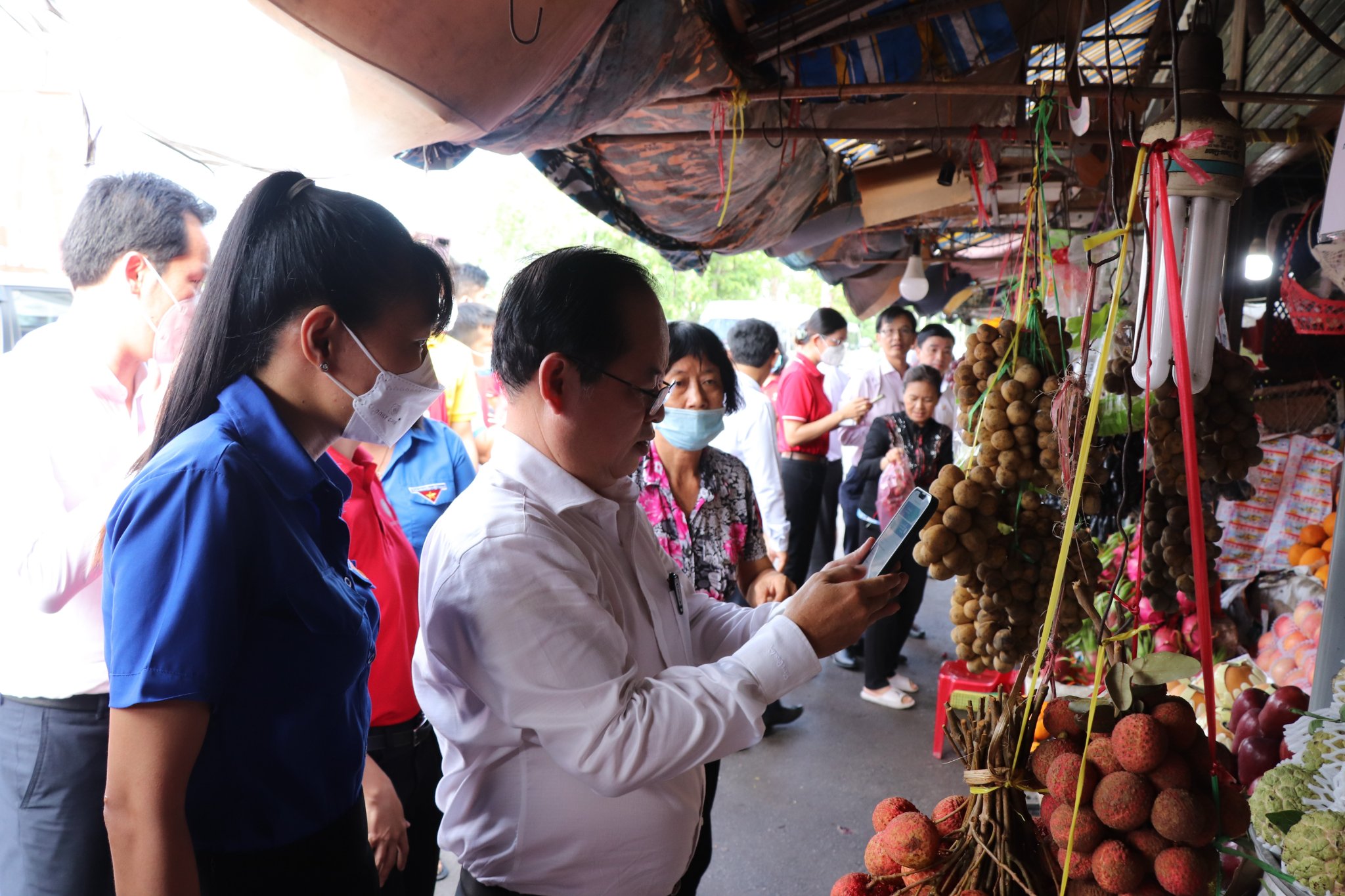 Đại biểu trải nghiệm thanh toán không dùng tiền mặt tại chợ Bến Tre