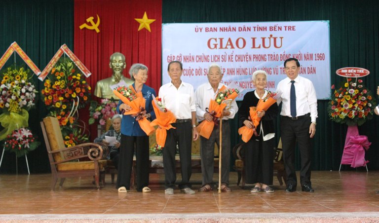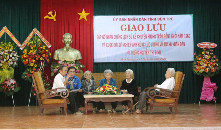 Trong buổi giao lưu, các cô, chú đã xúc động kể về quá trình đấu tranh giành độc lập dân tộc của quân và dân Bến Tre trong phong trào Đồng Khởi. Dưới ánh sáng của Nghị quyết 15, rạng sáng ngày 17/01/1960, 162 đảng viên của Bến Tre cùng đồng bào toàn tỉnh đã đồng loạt nổi dậy bằng gậy, giáo mác, mã tấu, lựu đạn, mìn, súng ngựa trời tự chế, bàn chông đứng lên đồng loạt diệt ác, phá kiềm, giành quyền làm chủ tại nhiều thôn, ấp, xã, đánh bại cuộc phản kích của 10.000 thủy quân lục chiến, bảo toàn lực lượng, giải phóng phần lớn nông thôn, làm nên cuộc Đồng Khởi Bến Tre vang dội, đặc biệt khắc họa lại hình ảnh nữ tướng Nguyễn Thị Định và Đội quân tóc dài của phong trào Đồng Khởi năm xưa “Anh hùng, bất khuất, trung hậu, đảm đang”.