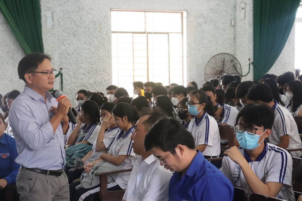 Tham dự có đồng chí Võ Thị Phương Diệu - Phó Bí thư Tỉnh đoàn, Chủ tịch Hội đồng Đội tỉnh; đồng chí Đặng Mai Giảng Tân - Quyền Giám đốc Trung tâm Xúc tiến đầu tư và Khởi nghiệp tỉnh; các đồng chí Ban Thường vụ Huyện đoàn Bình Đại; đại diện lãnh đạo nhà trường và 200 bạn học sinh Trường THPT Lê Hoàng Chiếu.