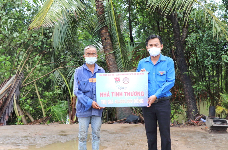 Đồng chí Hà Quốc Cường - Bí thư Tỉnh đoàn trao bảng tượng trưng nhà tình thương cho anh Ngô Văn Sang