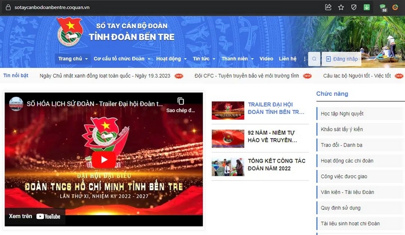 “Sổ tay điện tử cán bộ Đoàn” tỉnh Bến Tre với địa chỉ truy cập: https://sotaycanbodoanbentre.coquan.vn/ và app “Cán bộ đoàn Bến Tre” (có đầy đủ trên các nền tảng IOS và Android) với nhiều tính năng cần thiết, là địa chỉ đáng tin cậy để các bạn Cán bộ Đoàn, đoàn viên, thanh niên và người dân tìm kiếm và kết nối các thông tin liên quan đến công tác Đoàn Hội Đội tỉnh nhà như: Cơ cấu tổ chức Đoàn; các hình ảnh, video clip, hoạt động nổi bật về công tác Đoàn, Hội, Đội; các gương thanh niên tiêu biểu, thanh niên khởi nghiệp và các mô hình hay tại tỉnh.