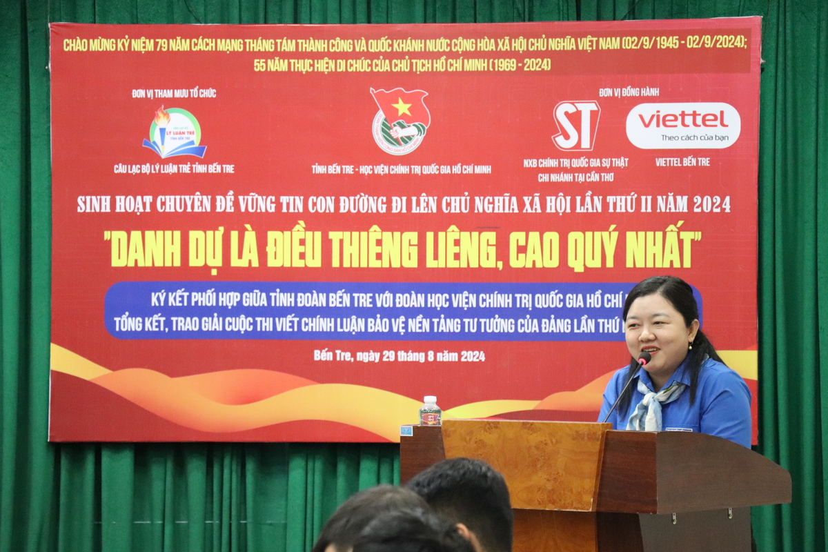 Phát biểu tại sinh hoạt, đồng chí Lâm Như Quỳnh - Bí thư Tỉnh đoàn nhấn mạnh Chủ tịch Hồ Chí Minh, các đồng chí lãnh đạo tiền bối kiên trung cũng như Cố Tổng Bí thư Nguyễn Phú Trọng là tấm gương sáng ngời về danh dự sống của một người cộng sản. Danh dự không chỉ là một từ ngữ mang tính tượng trưng, không chỉ phản ánh phẩm chất, nhân cách của cá nhân mà còn là danh dự của tập thể tổ chức, là thước đo để Nhân dân nói chung và thanh thiếu nhi tin yêu và đi theo mình. Danh dự là sợi chỉ đỏ dẫn đường cho thế hệ trẻ trong công cuộc xây dựng quê hương, đất nước, từng bước hiện thực hoá “Khát vọng Bến Tre 2045”. Việc giữ gìn lý tưởng, đạo đức, danh dự của người cộng sản trẻ là yếu tố nền tảng nhất. Đoàn viên, thanh niên cần bắt đầu từ những điều nhỏ nhặt, từ sự trung thực, lòng tự trọng, để xây dựng một cuộc sống ý nghĩa, một xã hội tốt đẹp.