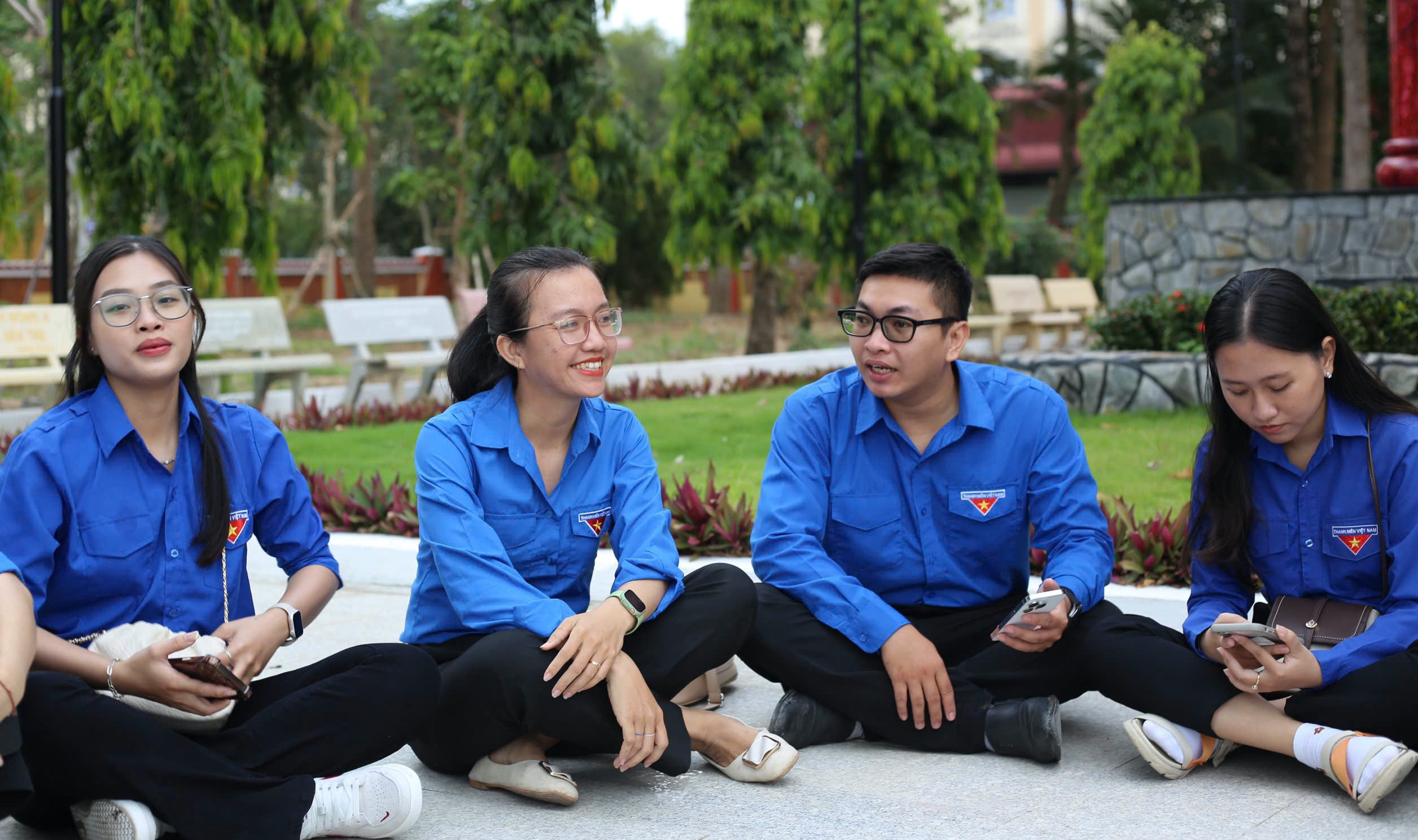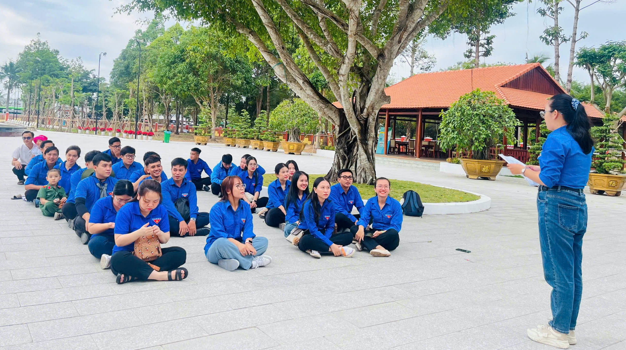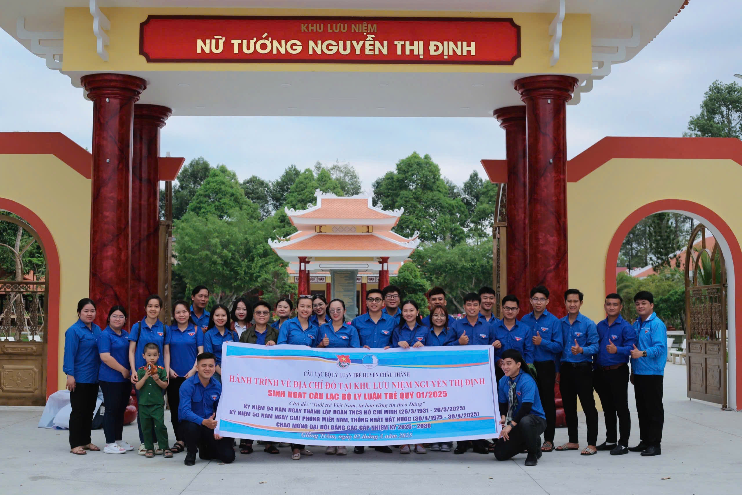 Thành viên câu lạc bộ Lý luận trẻ huyện Châu Thành chụp ảnh tại Khu lưu niệm Nữ tướng Nguyễn Thị Định