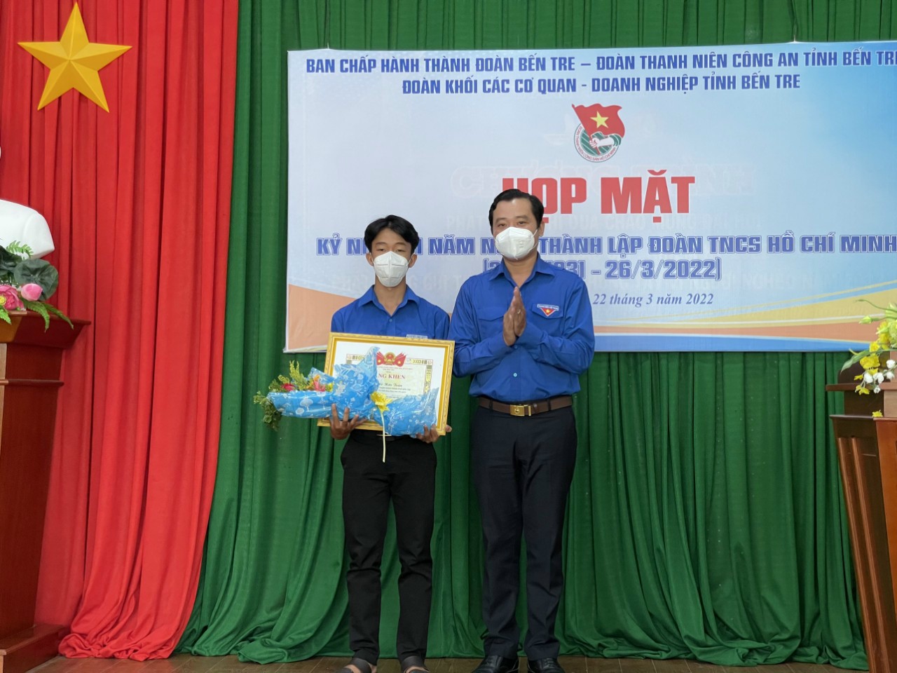 Đồng chí Võ Tuấn Thông - Phó Bí thư Thường trực Tỉnh đoàn trao bằng khen cho em Lê Hữu Toàn, tại buổi họp mặt kỷ niệm 91 năm Ngày thành lập Đoàn TNCS Hồ Chí Minh tại Thành đoàn Bến Tre