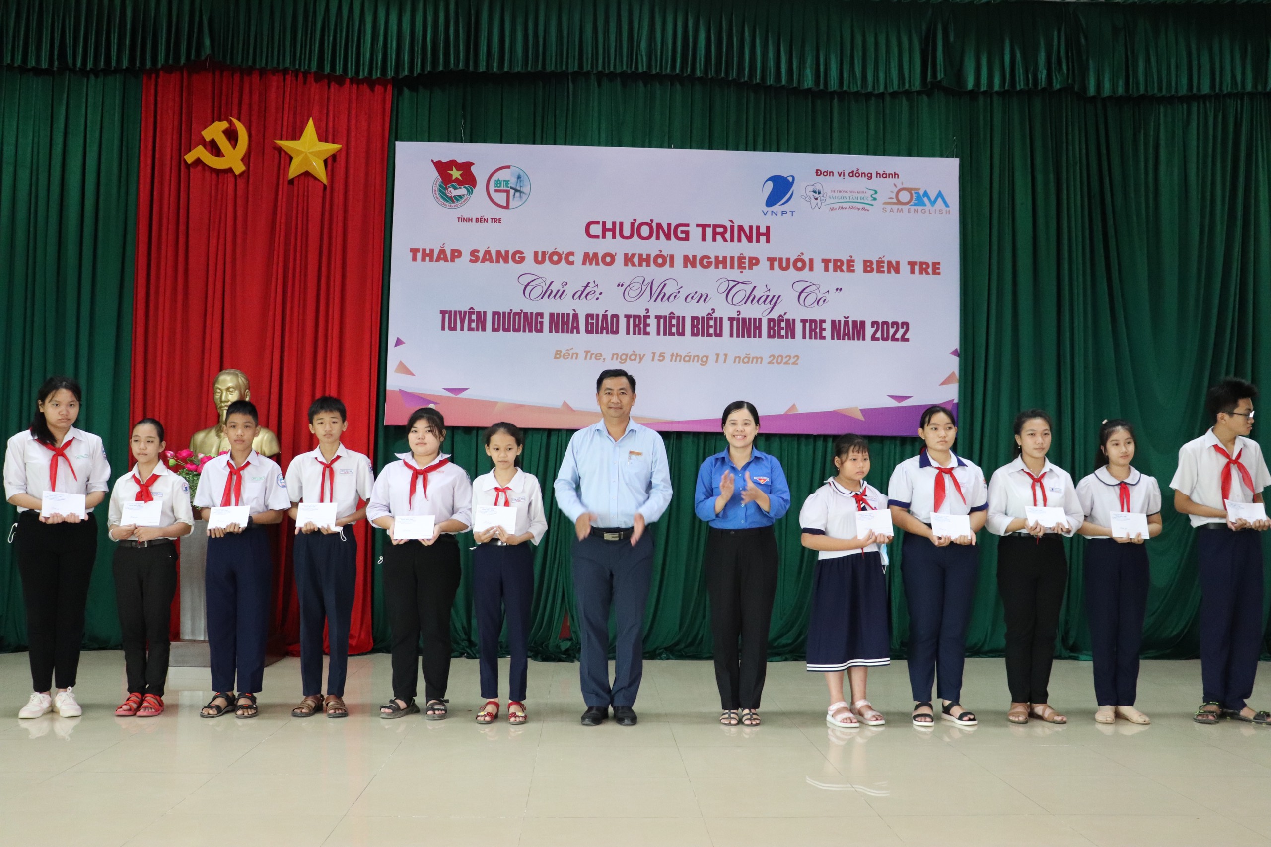 Chương trình cũng đã trao tặng 03 phần học bổng “Thắp sáng ước mơ tuổi trẻ Bến Tre” mỗi suất trị giá 3.000.000 đồng cho 03 em học sinh, sinh viên có hoàn cảnh khó khăn, học giỏi để tiếp thêm động lực giúp các em vững tin vào tương lai tươi sáng. Đồng thời, Ban Thường vụ Tỉnh đoàn thay mặt Nhà xuất bản Kim Đồng đoàn trao tặng 20 suất học bổng Đôrêmon cho 20 em học sinh khó khăn, học giỏi.
