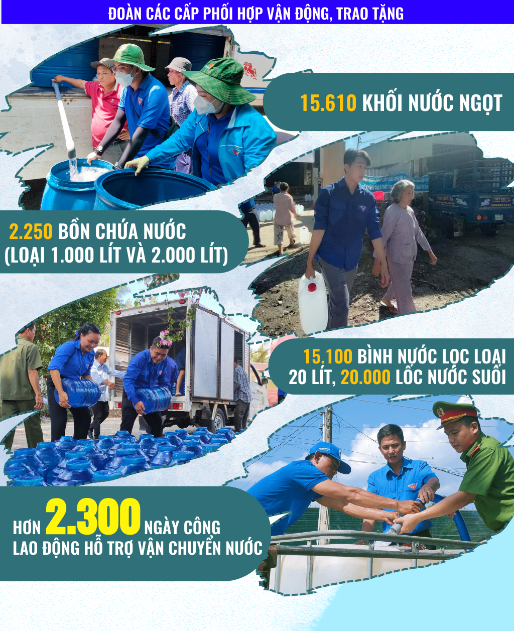 Kết quả Ban Thường vụ Tỉnh đoàn, Hội LHTN Việt Nam tỉnh, Hội đồng Đội tỉnh đã tổ chức trao tặng 3.915 khối nước ngọt, 324 bồn chứa nước (trong đó 269 bồn chứa nước loại 2.000 lít, 50 bồn chứa nước loại 5.000 lít, 15 bồn loại 1.000 lít), 8.890 bình nước 21 lít và can 30 lít, 45.168 chai nước uống đóng chai với tổng kinh phí 2,3 tỷ đồng. Đoàn các cấp đã phối hợp trao tặng 15.610 khối nước ngọt, 2.250 bồn chứa nước (loại 1.000 lít và 2.000 lít), 15.100 bình nước lọc loại 20 lít, 20.000 lốc nước suối, hơn 2.300 ngày công lao động.