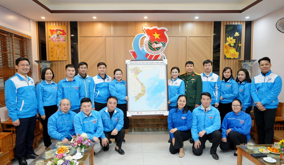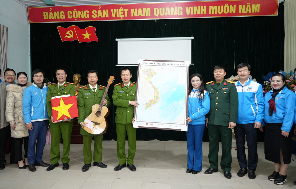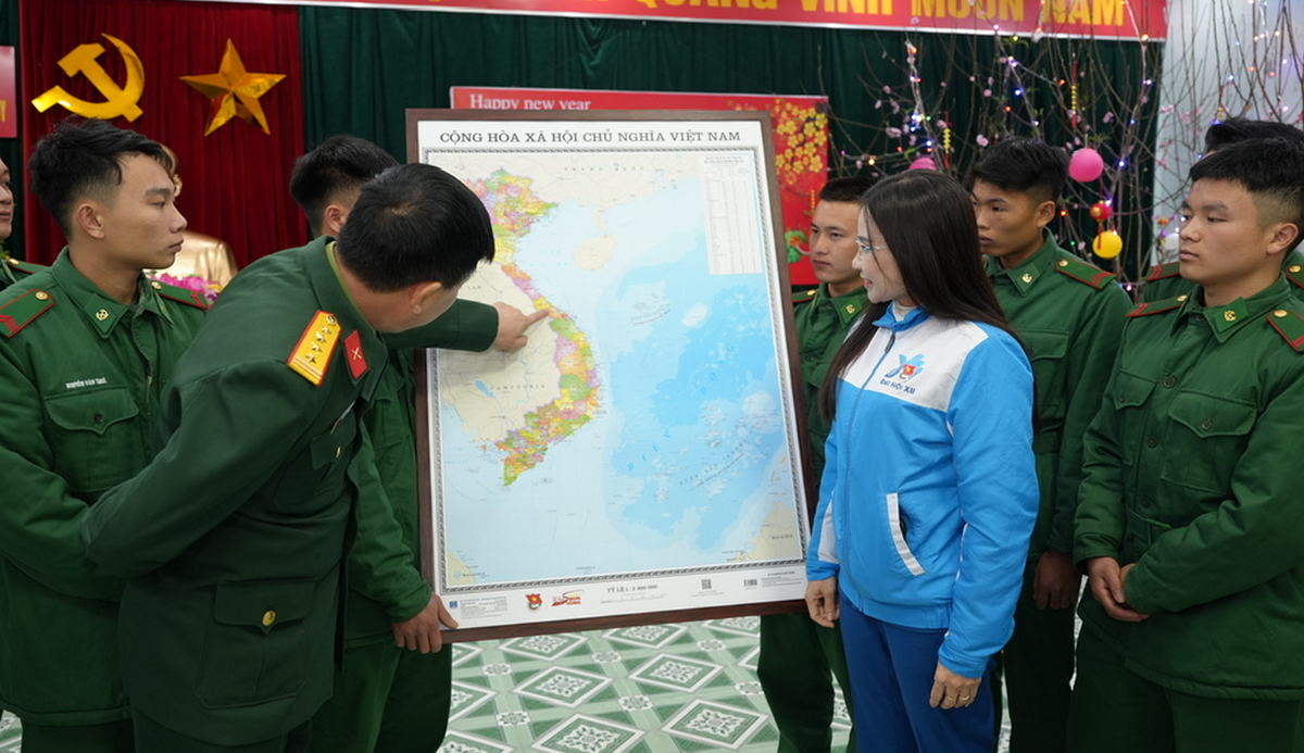 Đồng chí Nguyễn Phạm Duy Trang - Bí thư T.Ư Đoàn, Chủ tịch Hội đồng Đội T.Ư cùng đoàn công tác trao tặng bản đồ Việt Nam, cờ Tổ quốc cùng quà Tết cho Đồn biên phòng cửa khẩu quốc tế Thanh Thủy