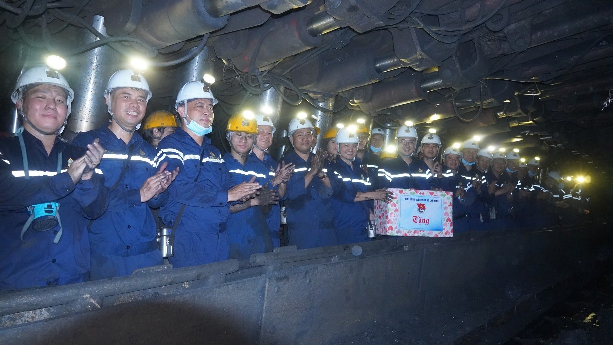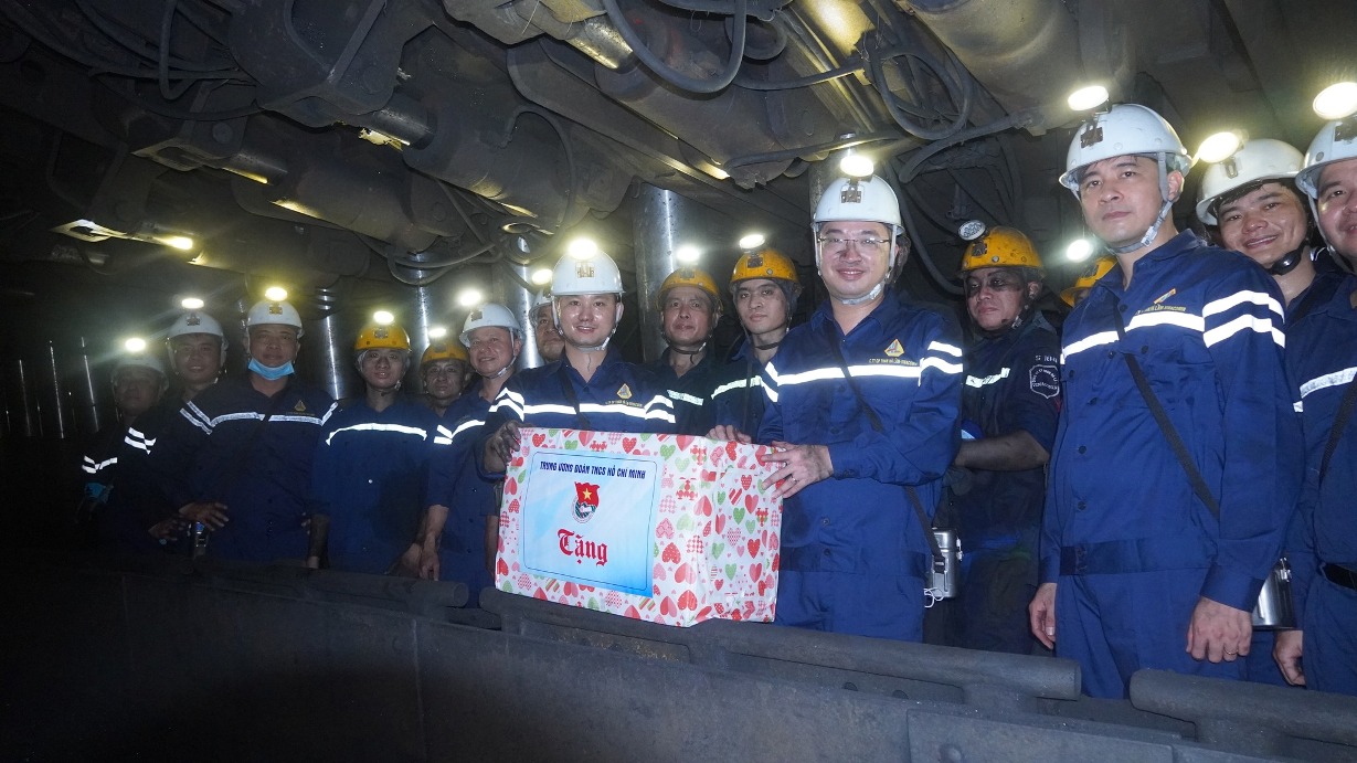 Tại hầm khai thác than ở độ sâu -300m so với mực nước biển, đồng chí Bí thư Trung ương Đoàn và các đồng chí trong đoàn công tác của Trung ương Đoàn, đại biểu đại diện các đơn vị Cụm Đoàn trực thuộc đã thăm khu vực khai thác chính, hệ thống đường dẫn, máy móc trang thiết bị tại hầm, gặp gỡ và tặng quà động viên thanh niên công nhân đang lao động, sản xuất tại hầm.
