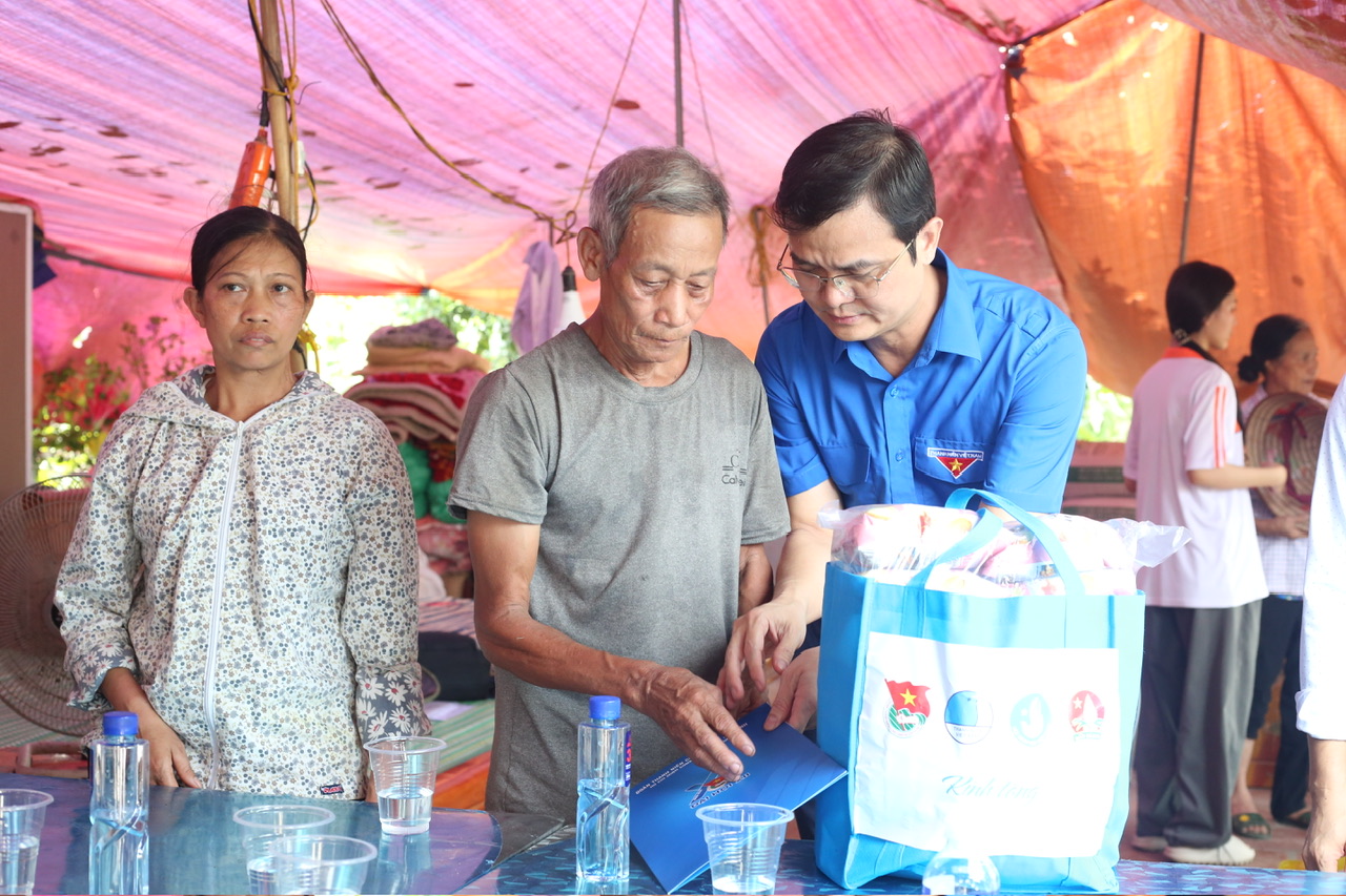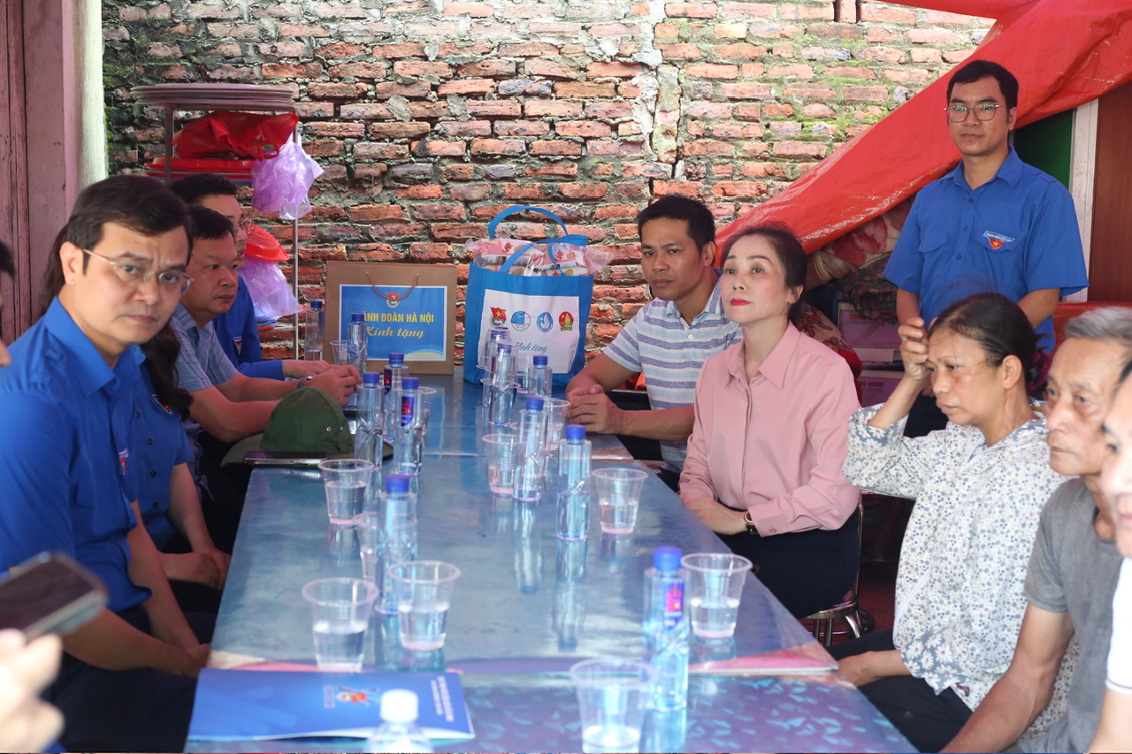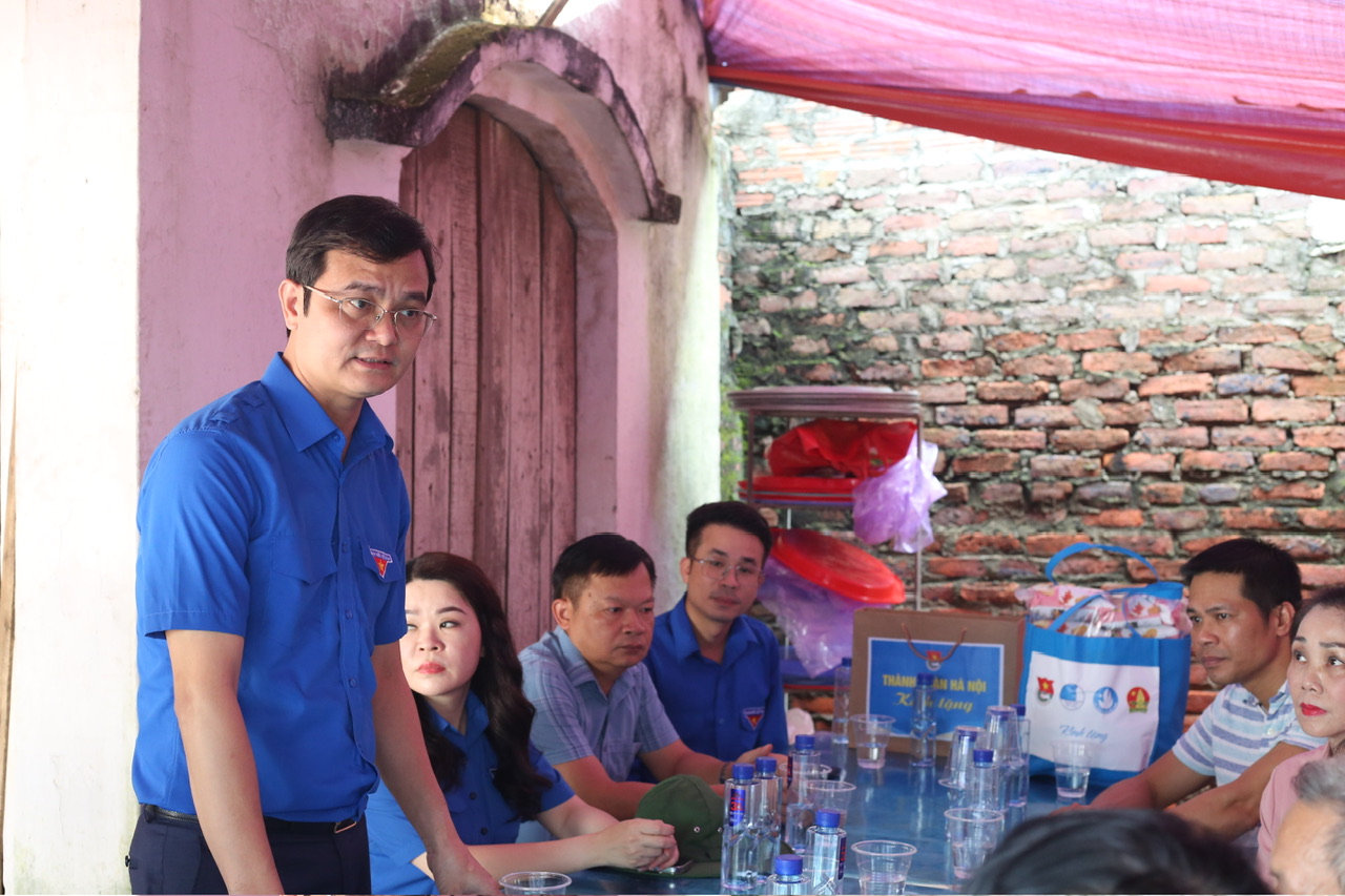Thay mặt đoàn công tác, đồng chí Bùi Quang Huy trao tặng hỗ trợ gia đình ông Thì 5 triệu đồng và 1 phần quà an sinh. Thành đoàn Hà Nội trao tặng gia đình ông Thì 5 triệu đồng và 1 túi an sinh.