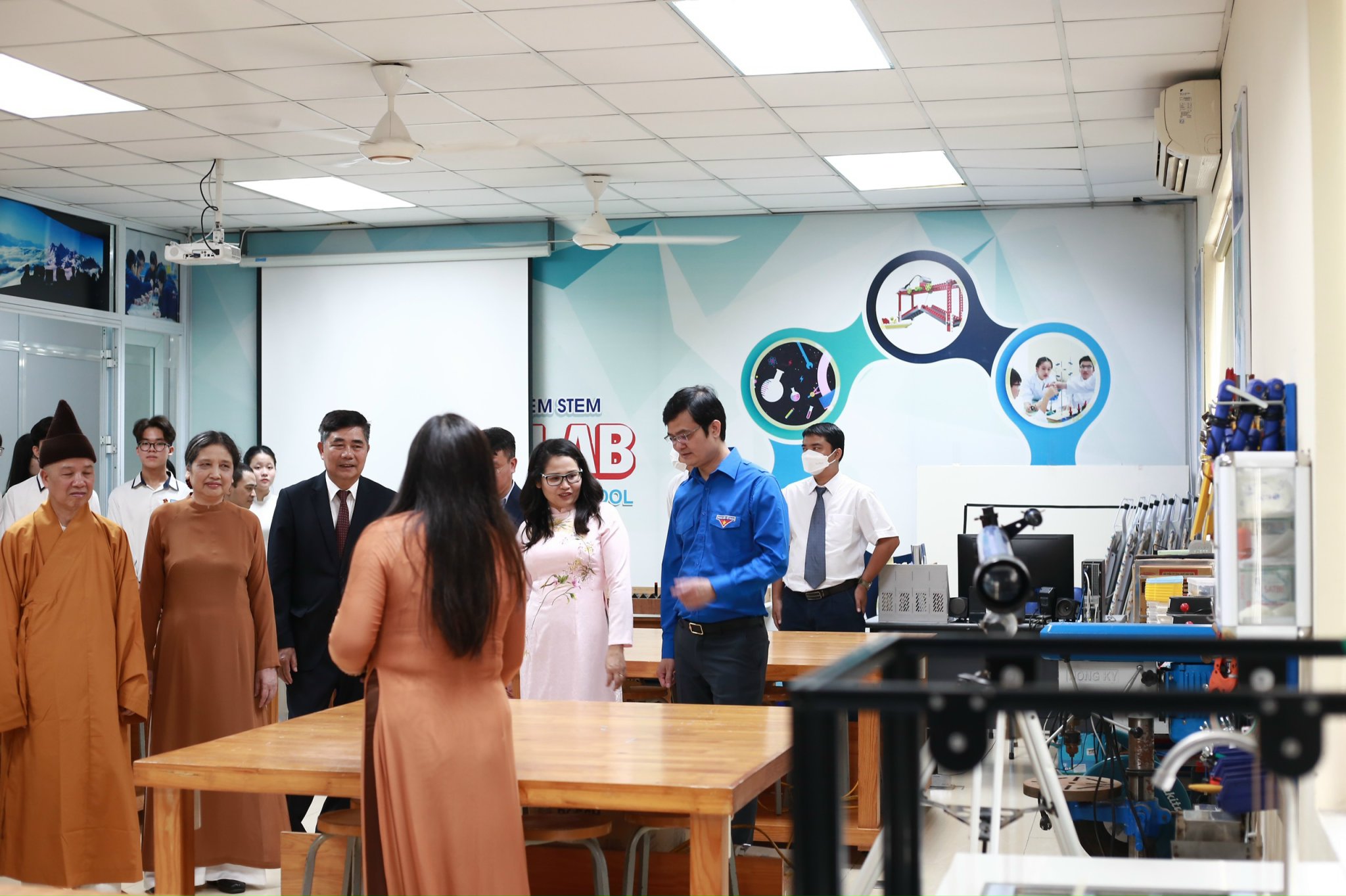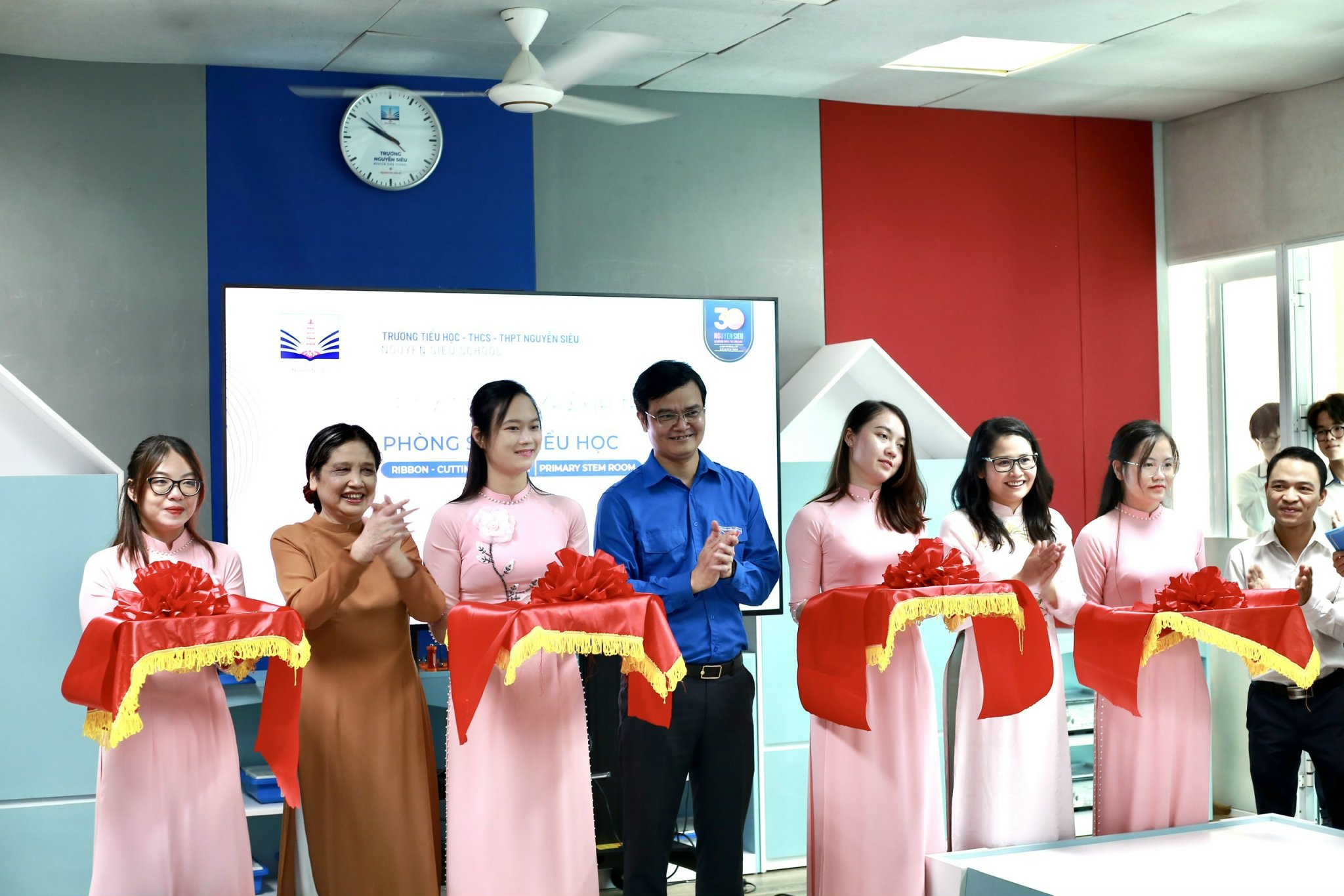 Đồng chí Bùi Quang Huy cùng các đại biểu cắt băng khánh thành và tham quan phòng STEM trường Tiểu học Nguyễn Siêu