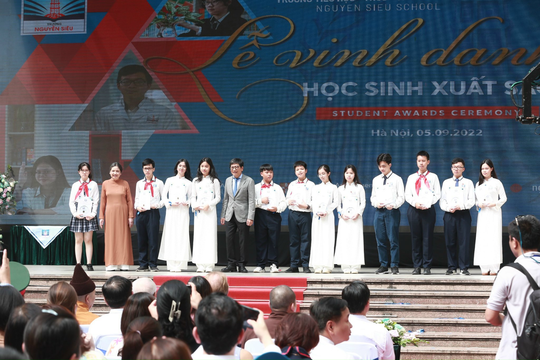 Nhân dịp này, Trường Nguyễn Siêu đã tổ chức lễ vinh danh học sinh giỏi xuất sắc, gương mẫu toàn diện đạt Học gương mẫu toàn diện đạt Học bổng Nguyễn Siêu,đạt thành tích cao trong kỳ thi THPT Quốc gia, đạt 100% điểm A/A* trong các kì thi Cambridge quốc tế năm 2022.