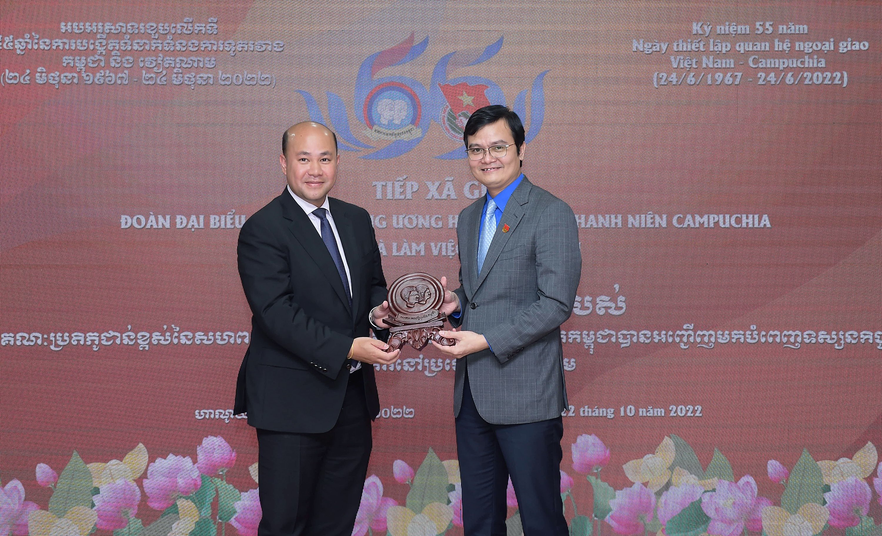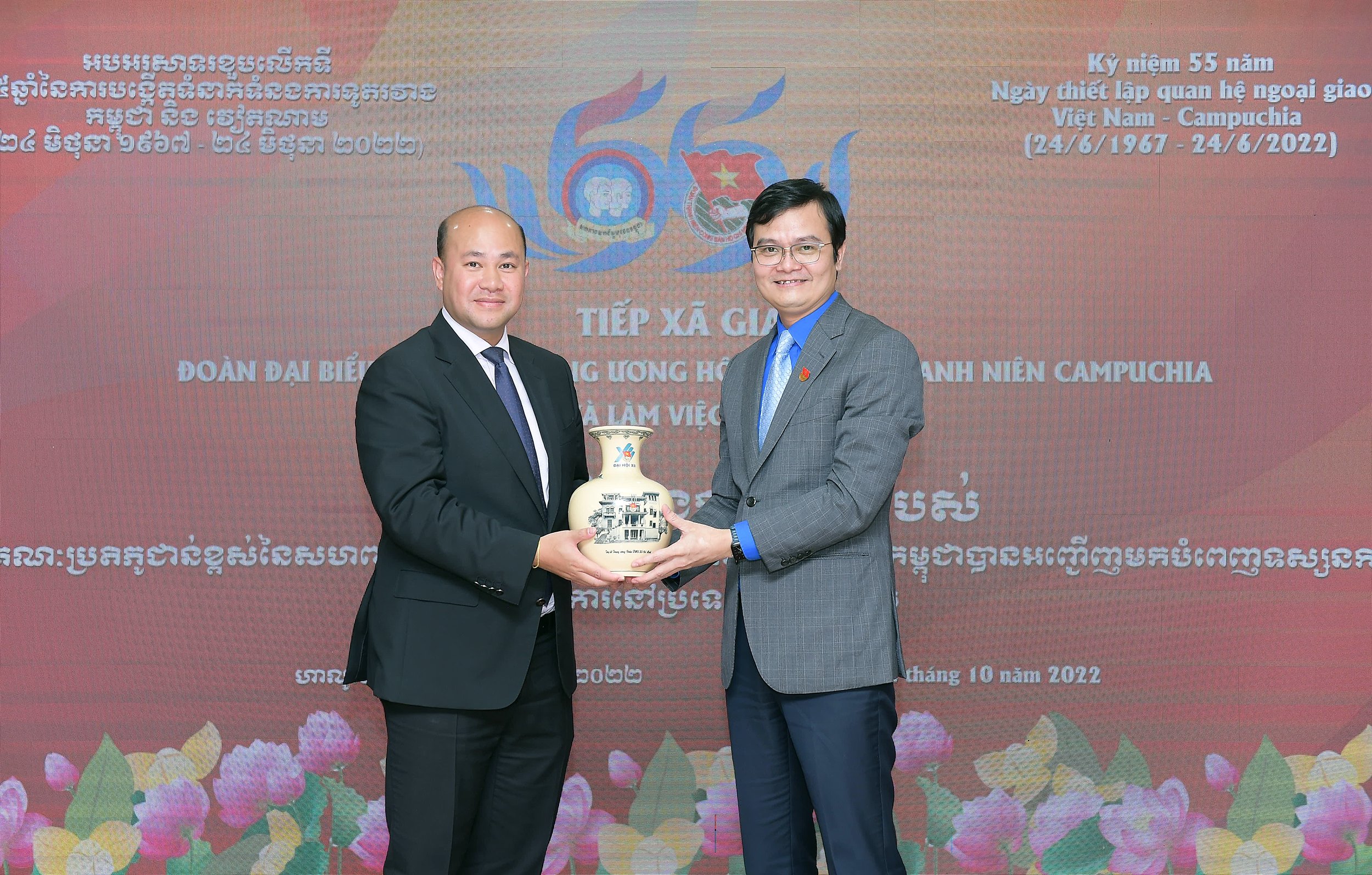 Đồng chí Bùi Quang Huy, Ủy viên dự khuyết T.Ư Đảng, Bí thư thứ nhất T.Ư Đoàn, Chủ nhiệm Ủy ban Quốc gia về Thanh niên Việt Nam và anh Hun Many, Ủy viên Trung ương Đảng Nhân dân Campuchia (CPP), Chủ nhiệm Ủy ban Giáo dục, Thanh niên, Thể thao, Văn hóa, Tôn giáo và Du lịch của Quốc hội, Chủ tịch Nhóm Nghị sỹ trẻ Campuchia, Chủ tịch Hội Liên hiệp Thanh niên Campuchia tặng quà lưu niệm