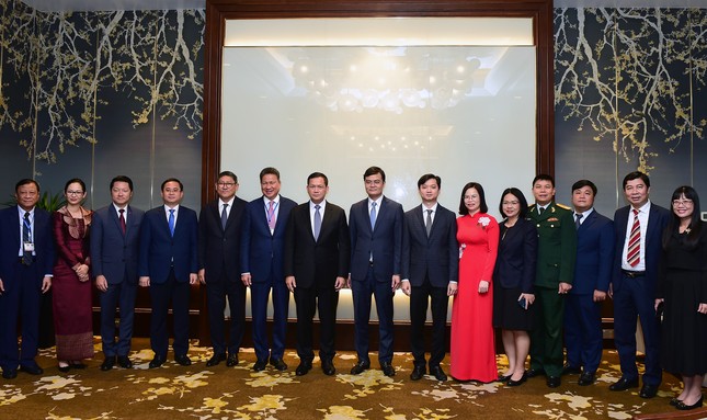 Thủ tướng Campuchia Hun Manet và Bí thư thứ nhất T.Ư Đoàn Bùi Quang Huy cùng đại biểu hai bên chụp ảnh lưu niệm. Ảnh: Xuân Tùng