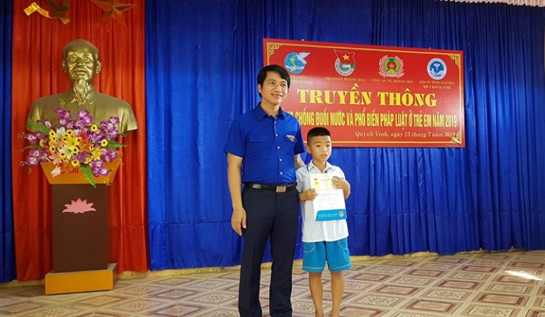 Bí thư Trung ương Đoàn Nguyễn Ngọc Lương trao Huy hiệu “Tuổi trẻ dũng cảm” cho em Nguyễn Quang Dũng, học sinh lớp 5A, Trường Tiểu học Quỳnh Dị (thị xã Hoàng Mai) vì đã có hành động dũng cảm cứu 1 em nhỏ bị đuối nước vào ngày 8/5 vừa qua.