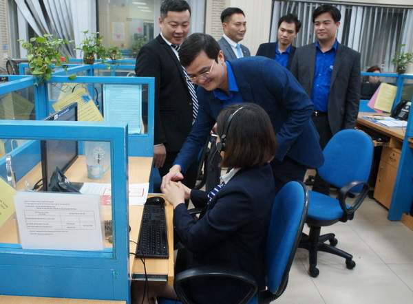 Đồng chí Bùi Quang Huy, Bí thư TƯ Đoàn lì xì năm mới chúc mừng đội ngũ Điện thoại viên đang trực chiến tại Trung tâm Chăm sóc khách hàng đêm giao thừa