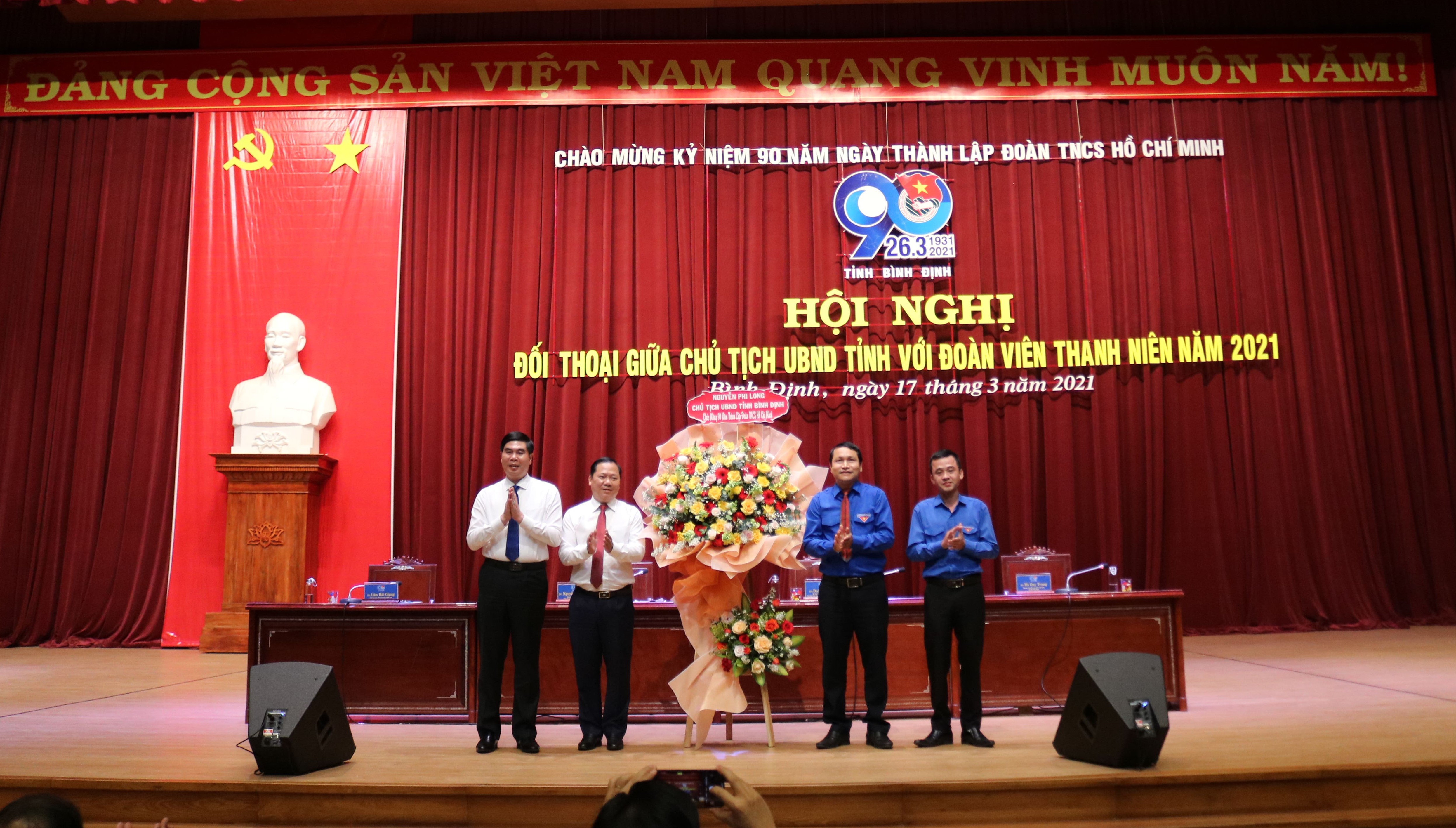 Đồng chí Nguyễn Phi Long tặng hoa nhân kỷ niệm 90 năm ngày thành lập Đoàn TNCS Hồ Chí Minh cho Thường trực Tỉnh đoàn