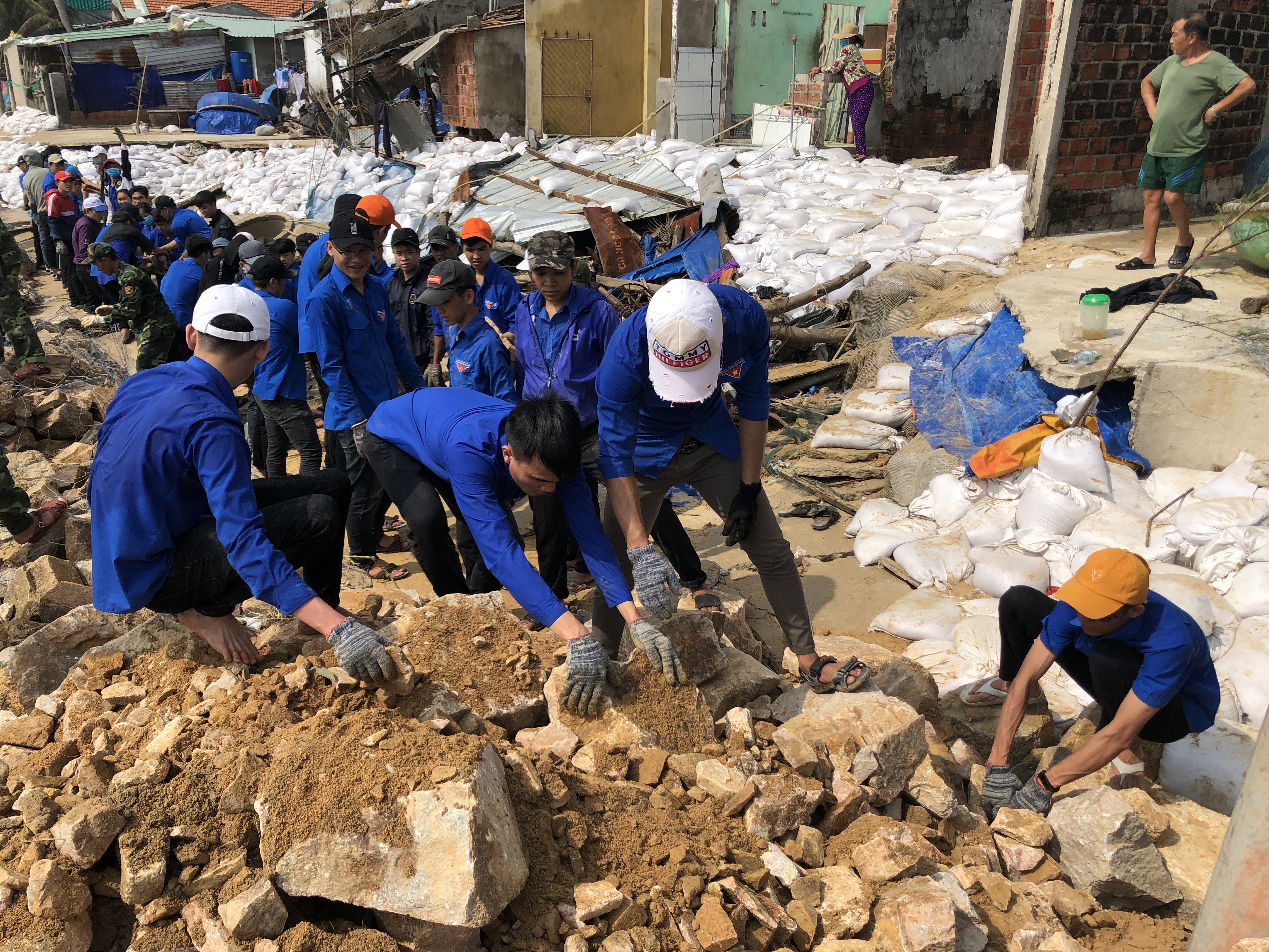 "Trước tình hình thời tiết phức tạp, nhiều khả năng có bão trong vài ngày tới, 200 đoàn viên, thanh niên ĐH Quy Nhơn, thành đoàn phối hợp lực lượng công an, quân đội ra quân hỗ trợ giúp dân gia cố lại tuyến kè xung yếu" - anh Vĩnh nói.