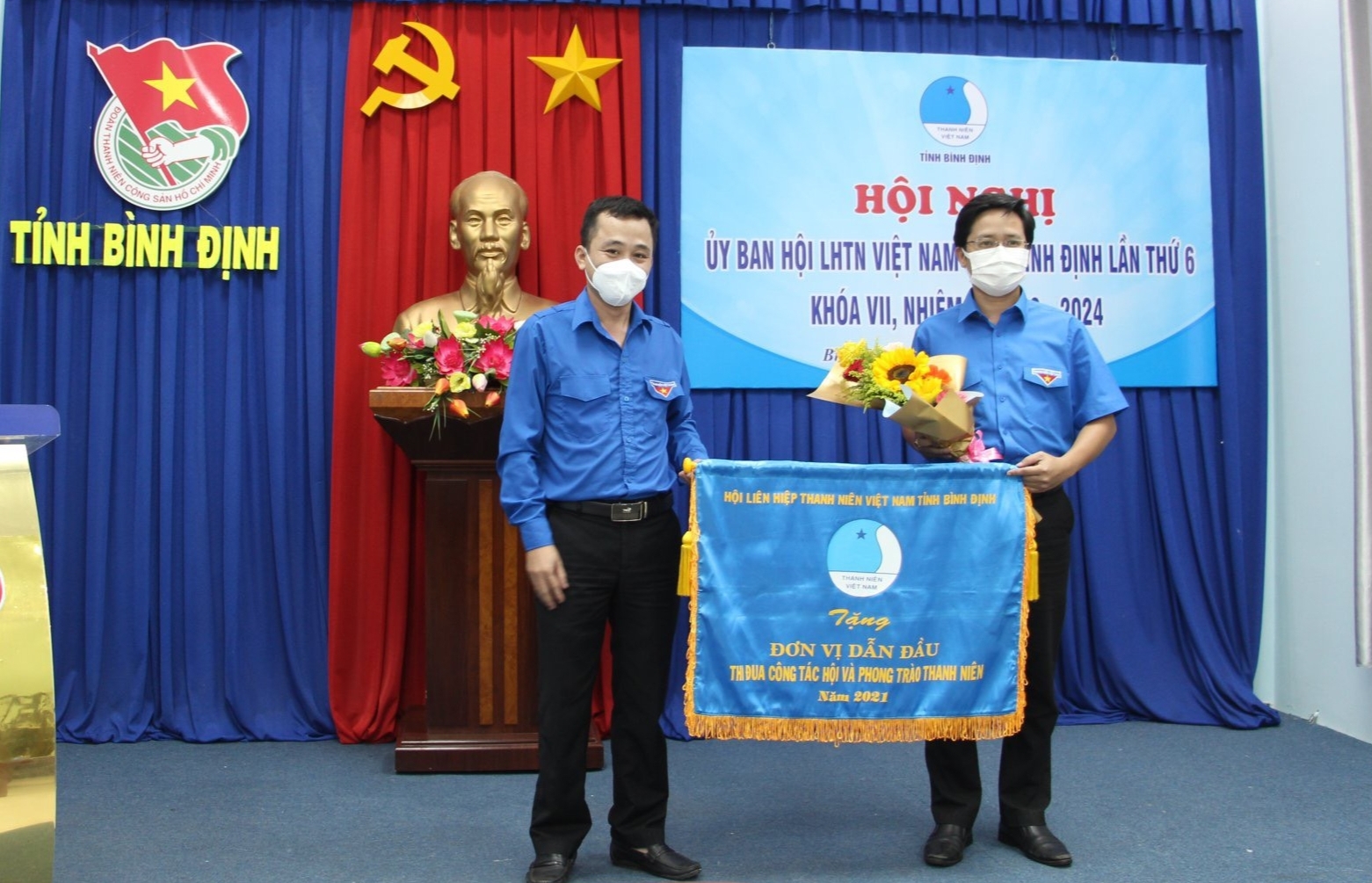 Anh Nguyễn Thành Trung - Phó Bí thư Thường trực Tỉnh đoàn, Chủ tịch Hội LHTN Việt Nam tỉnh tặng cờ đơn vị dẫn đầu trong công tác Hội và phong trào thanh niên năm 2021 cho Hội LHTN Việt Nam thành phố Quy Nhơn.