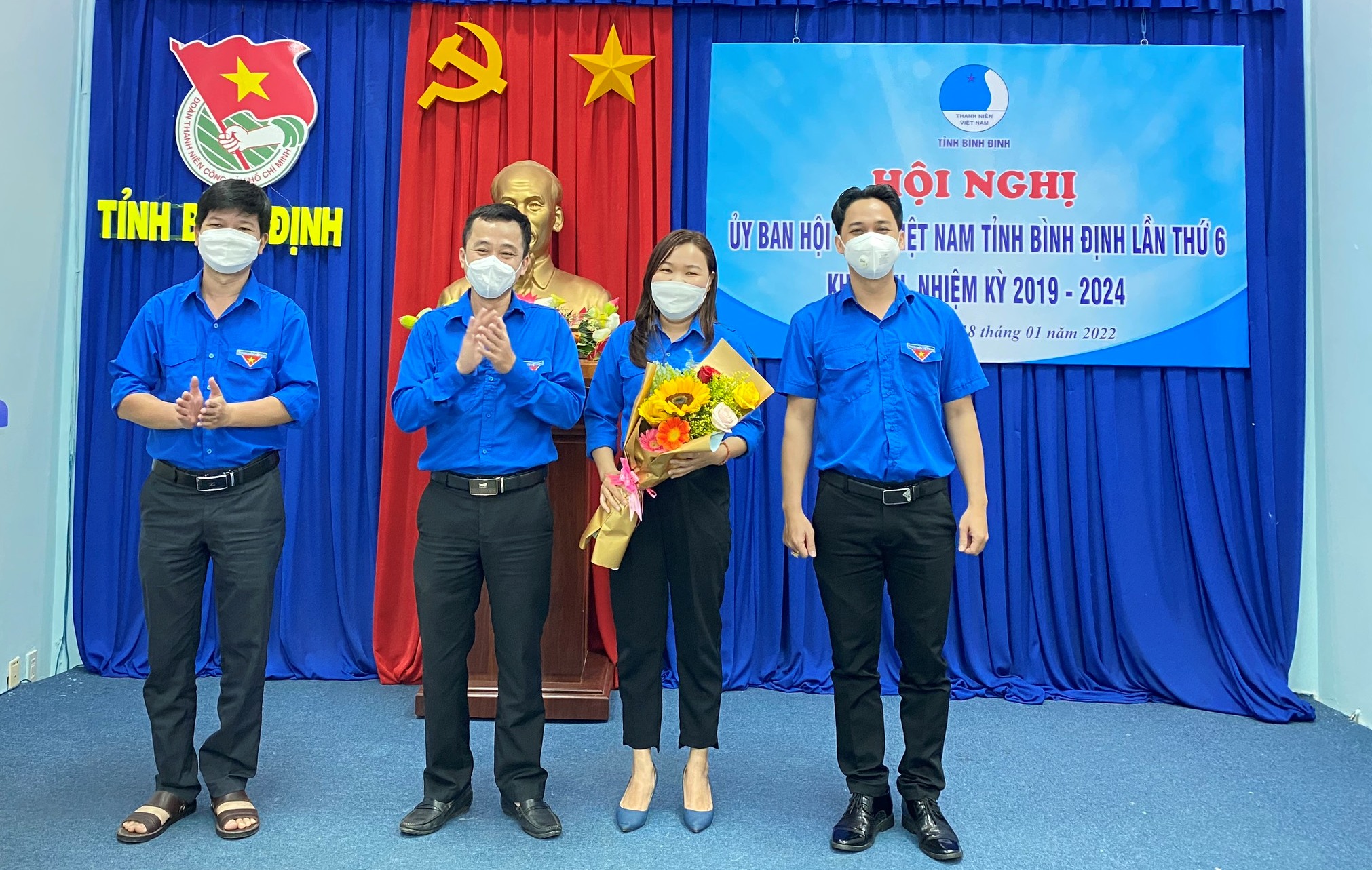 Anh Nguyễn Thành Trung - Phó Bí thư Thường trực Tỉnh đoàn, Chủ tịch Hội LHTN Việt Nam tỉnh tặng hoa chúc mừng các anh, chị được bầu bổ sung chức danh Ủy viên Ủy ban Hội và Ủy viên Ban Thư ký Hội LHTN Việt Nam tỉnh khóa VII, nhiệm kỳ 2019 - 2024