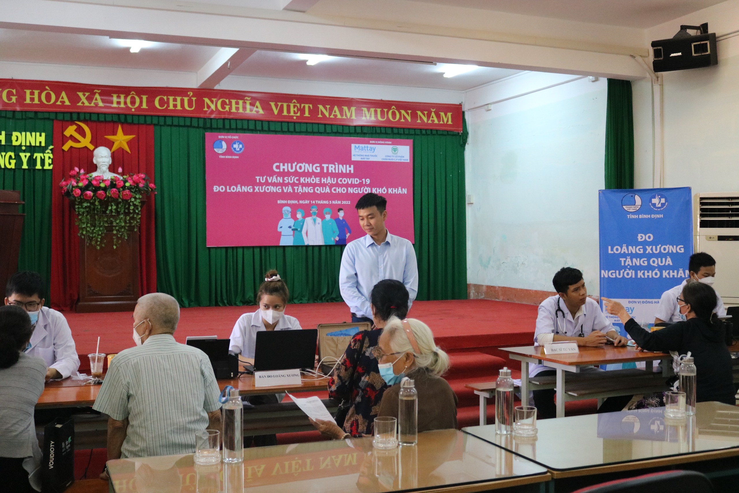 Nhân dịp này, Câu lạc bộ Thầy thuốc trẻ tỉnh đã tổ chức tư vấn sức khỏe, tặng sữa bổ xương khớp, khẩu trang và trứng gà cho 100  người dân hậu Covid-19 và người dân trên 40 tuổi bị loãng xương tại trường Cao đẳng Y tế Bình Định.
