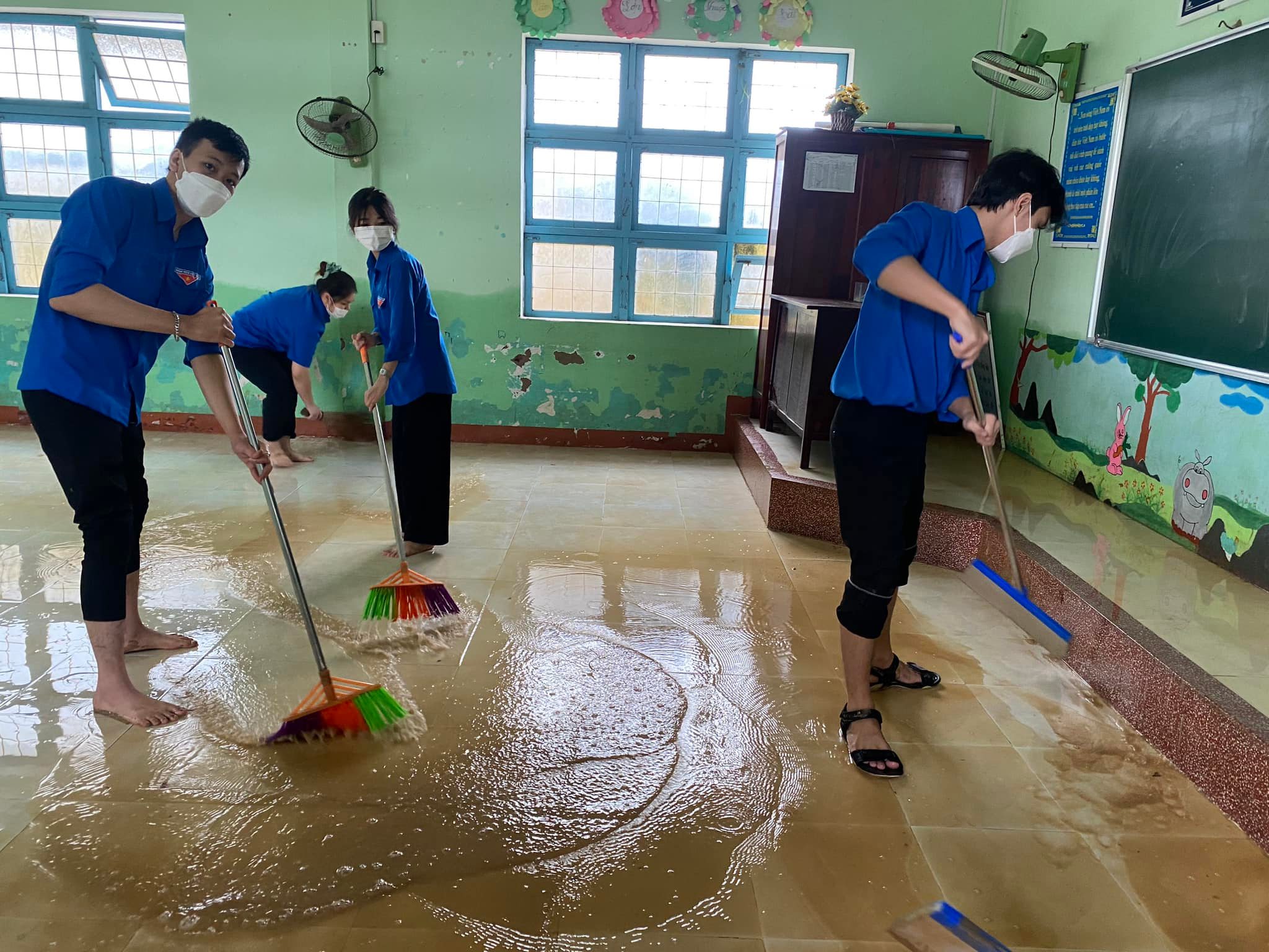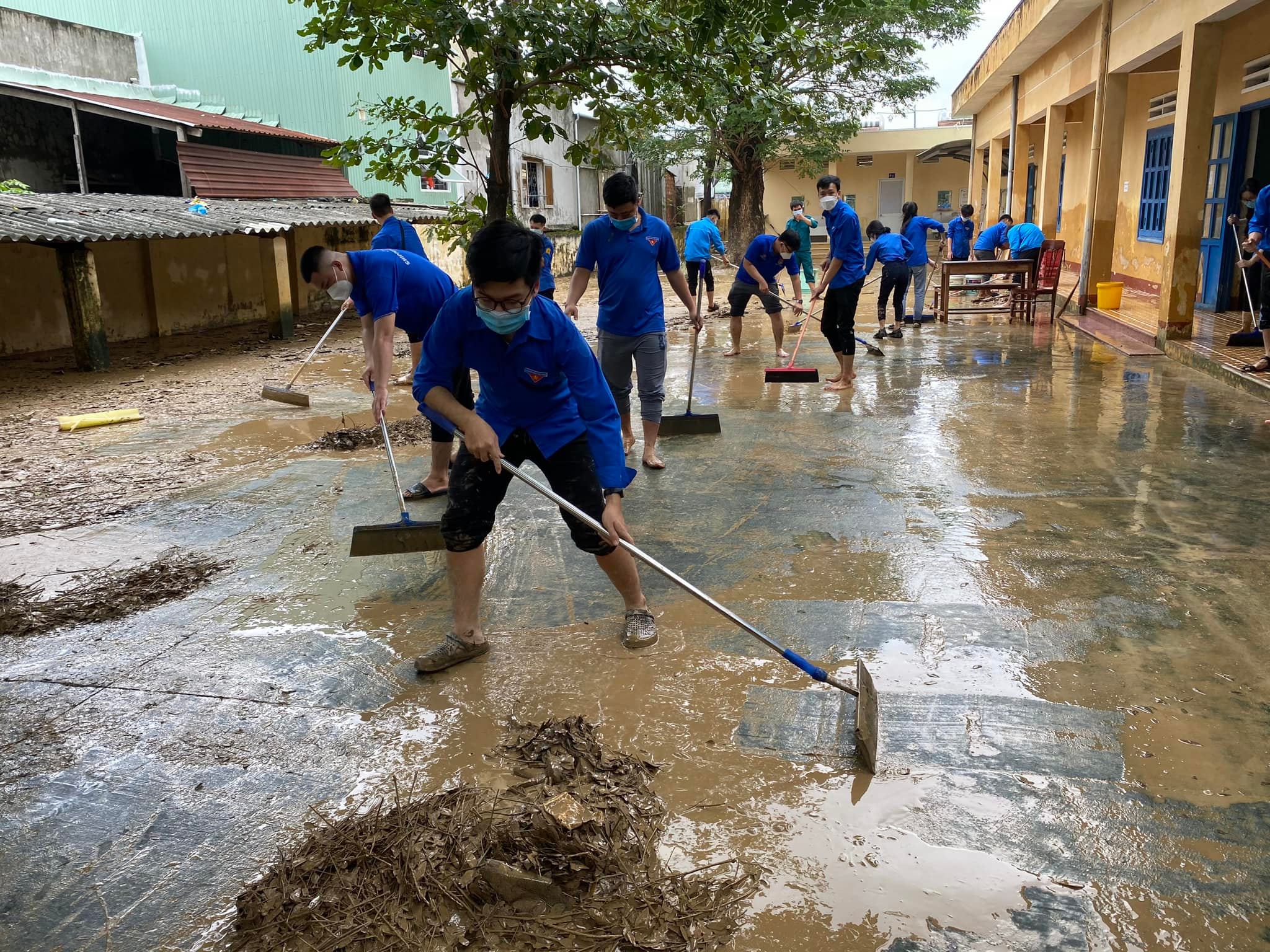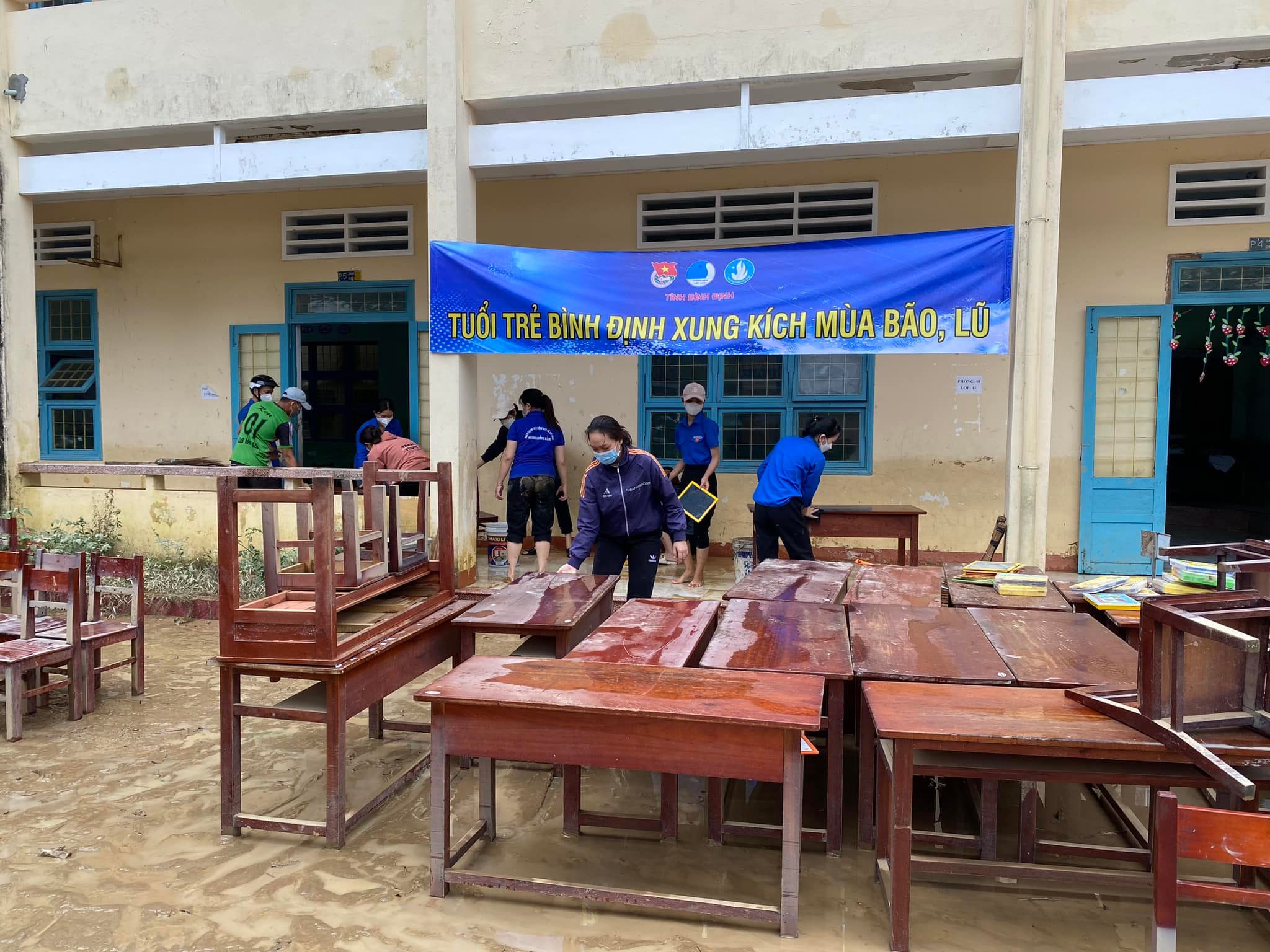 Theo đó, hơn 60 đoàn viên, thanh niên đội Thanh niên xung kích mùa bão lũ cấp tỉnh với sự tham gia của gồm lực lượng sinh viên trường Đại học Quy Nhơn và đoàn viên, thanh niên Thành đoàn Quy Nhơn đã ra quân giúp dọn dẹp, nạo lượng lớn bùn, đất cuốn vào các lớp học cho 06 trường: Trường Tiểu học số 1 Nhơn Bình, trường Tiểu học số 2 Nhơn Bình, trường Tiểu học Nhơn Phú, trường THCS Nhơn Bình, Trung tâm HĐTTN thành phố Quy Nhơn, trường mẫu giáo Nhơn Bình và điểm trường Khu phố 5.