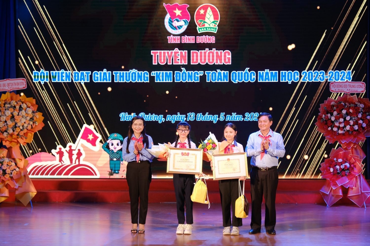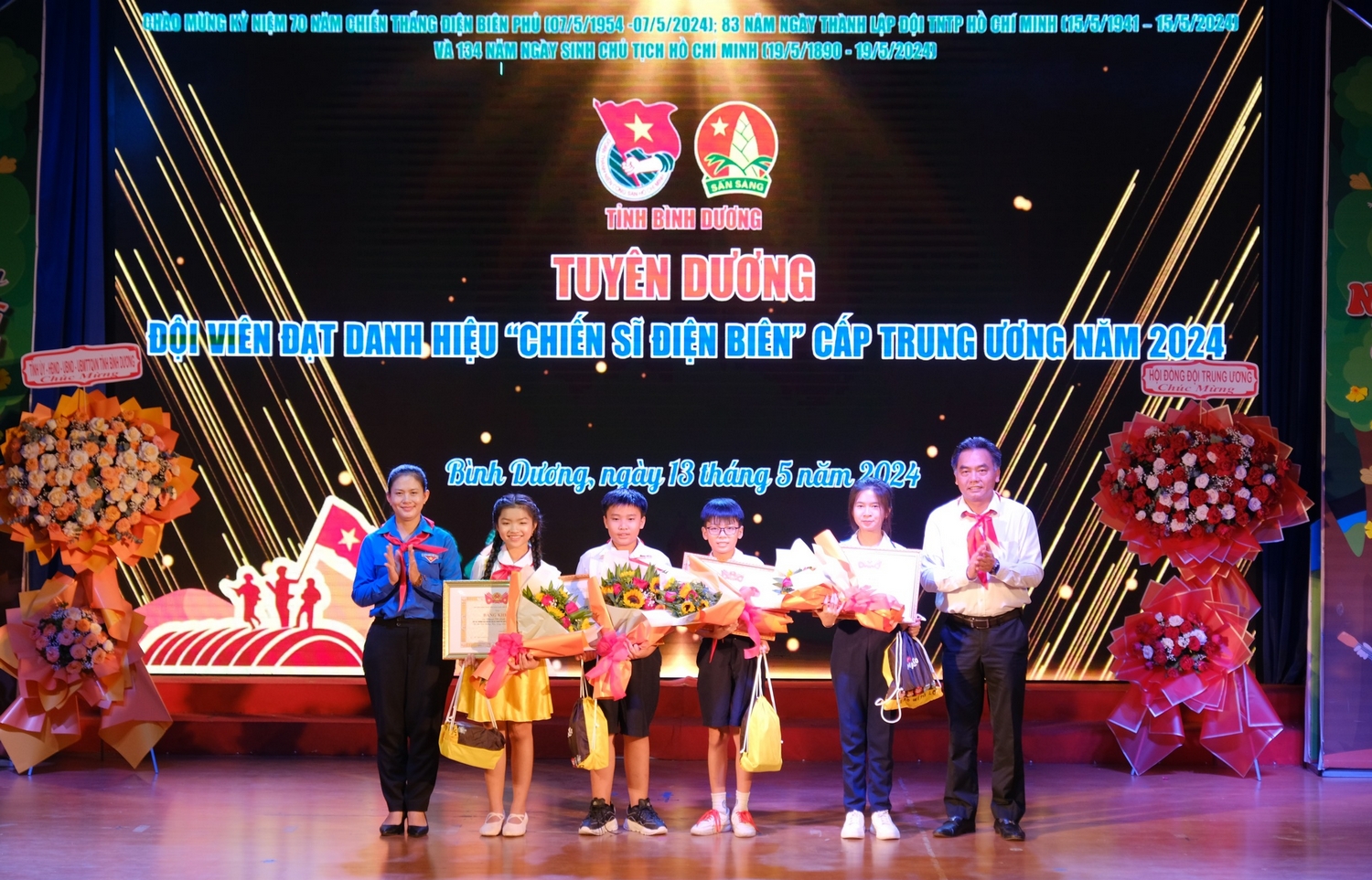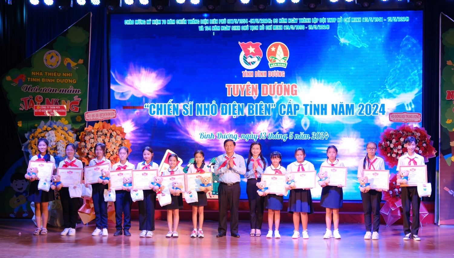 Đồng thời, tuyên dương 02 bạn đội viên đạt giải thưởng “Kim Đồng” năm học 2023-2024; 04 đại biểu thiếu nhi ưu tú đại diện Bình Dương tham gia Liên hoan Chiến sĩ nhỏ Điện Biên toàn quốc lần thứ 5 - năm 2024; trao giải cho các em đạt thành tích xuất sắc tại các cuộc thi của Trung ương; tuyên dương 71 em đội viên đạt danh hiệu “Chiến sĩ nhỏ Điện Biên” cấp tỉnh năm 2024.
