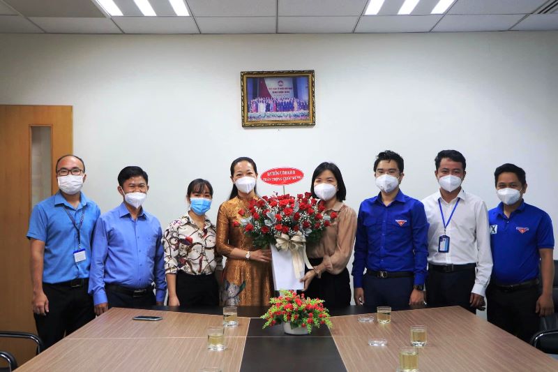 Đồng chí Nguyễn Thị Ngọc Xuân - Bí thư Tỉnh Đoàn Bình Dương trân trọng chúc mừng và trao tặng hoa cho đồng chí Trần Thị Hồng Hạnh - Phó Chủ tịch Thường trực Mặt trận Tổ quốc Việt Nam tỉnh