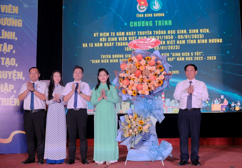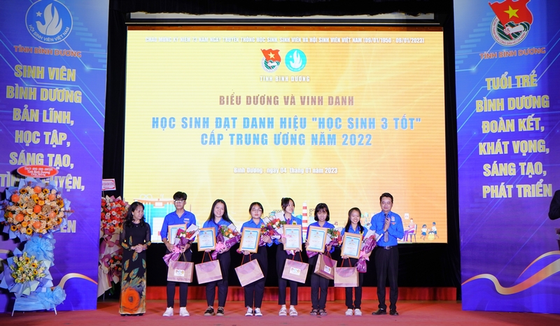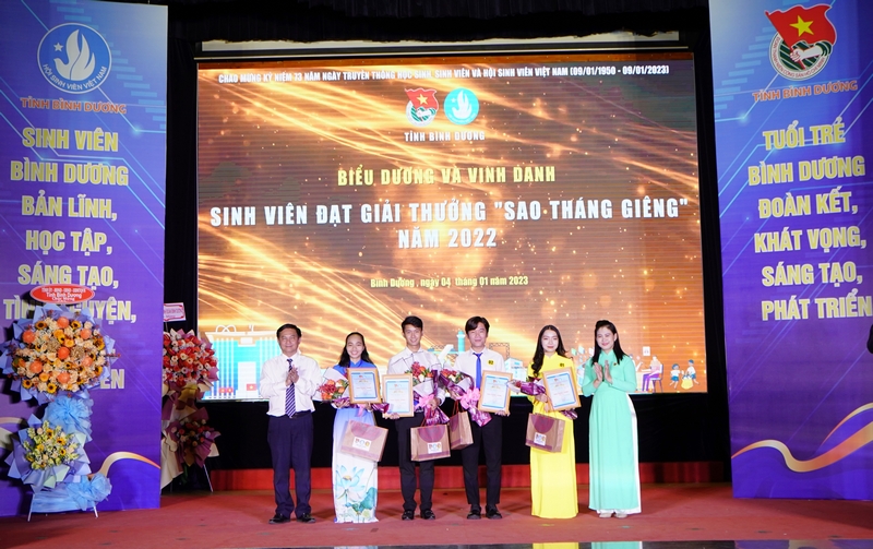 Dịp này, Ban Thường vụ Tỉnh đoàn, Ban Thư ký Hội SV tỉnh đã biểu dương và vinh danh 04 SV đạt giải thưởng “Sao Tháng Giêng” năm 2022, 02 SV đạt danh hiệu “SV 5 tốt” cấp Trung ương năm 2022 và 08 HS đạt danh hiệu danh hiệu HS 03 tốt cấp Trung ương. Đồng thời tuyên dương, khen thưởng 03 tập thể và 52 cá nhân đạt danh hiệu “SV 5 tốt” cấp tỉnh năm học 2022 – 2023; tuyên dương 09 SV đạt danh hiệu “SV Bình Dương – Những câu chuyện đẹp” năm học 2022 – 2023.