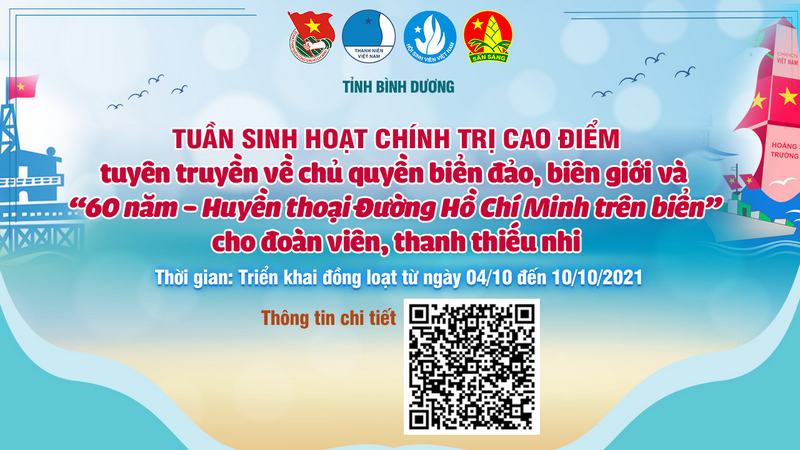 Được biết, Tuần sinh hoạt chính trị cao điểm tuyên truyền về chủ quyền biển đảo, biên giới và “60 năm - Huyền thoại Đường Hồ Chí Minh trên biển” cho đoàn viên, thanh thiếu nhi được Ban Thường vụ Tỉnh Đoàn Bình Dương triển khai thực hiện đồng loạt từ ngày 04/10 đến 10/10/2021; tổ chức ít nhất 90 Hành trình tuyên truyền về chủ quyền biển đảo, biên giới và “60 năm - Huyền thoại Đường Hồ Chí Minh trên biển” cho đoàn viên, thanh thiếu nhi thông qua các buổi sinh hoạt chi Đoàn, chi Hội. Trong đó cấp tỉnh sẽ tổ chức thực hiện 01 phóng sự và tổ chức công chiếu 07 bộ phim tư liệu về chủ quyền biển đảo, biên giới và “60 năm - Huyền thoại Đường Hồ Chí Minh trên biển” cho đoàn viên, thanh thiếu nhi trên Trang Fanpage Tuổi trẻ Bình Dương từ ngày 02/10 đến 10/10/2021. 100% Đoàn cấp huyện và 100% Đoàn cấp xã tổ chức ít nhất 01 buổi sinh hoạt tuyên truyền về chủ quyền biển đảo, biên giới và “60 năm - Huyền thoại Đường Hồ Chí Minh trên biển” cho đoàn viên, thanh thiếu nhi.