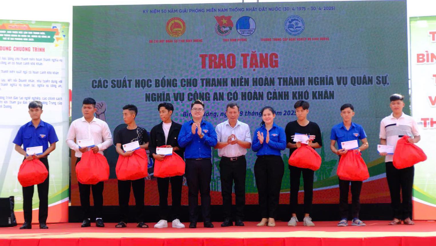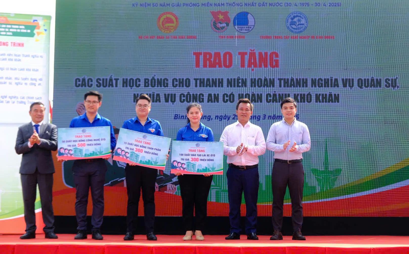 Tại chương trình, Trường trung cấp nghề nghiệp vụ Bình Dương đã trao gói hỗ trợ các thanh niên hoàn thành nghĩa vụ quân sự, nghĩa vụ công an trở về địa phương có hoàn cảnh khó khăn tham gia các khóa học đào tạo nghề cho Ban Thường vụ Tỉnh đoàn với tổng giá trị 1,1 tỷ đồng gồm: 15 suất học bổng toàn phần khi học Trung cấp công nghệ ô tô cho thanh niên hoàn thành nghĩa vụ quân sự, nghĩa vụ công an có hoàn cảnh khó khăn, tổng trị giá 300 triệu đồng; 50 suất học bổng (giảm 50%) khi học trung cấp công nghệ ôtô cho thanh niên hoàn thành nghĩa vụ quân sự, nghĩa vụ công an, tổng trị giá 500 triệu đồng.