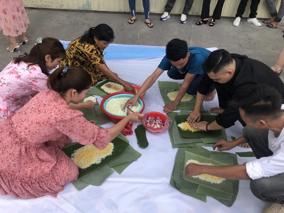 Thanh niên công nhân phấn khởi tham gia hội thi gói bánh Tét