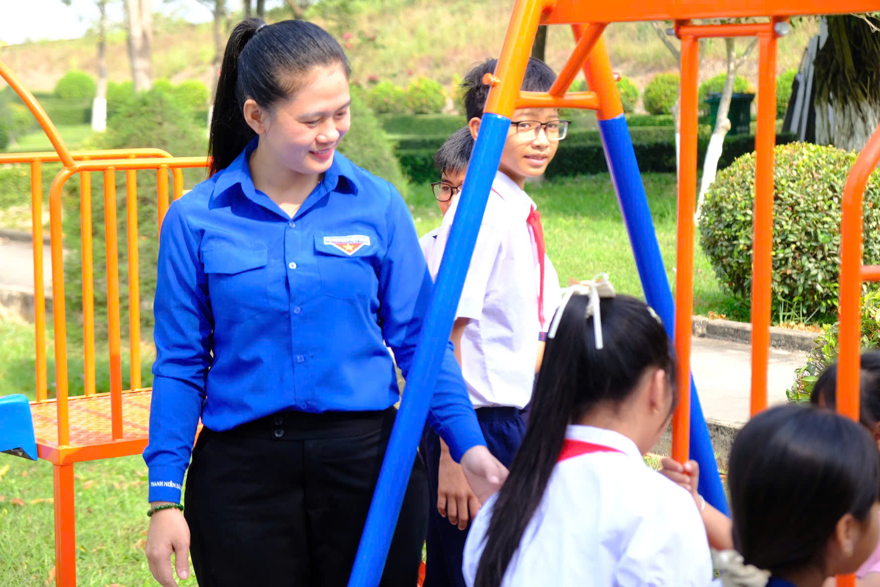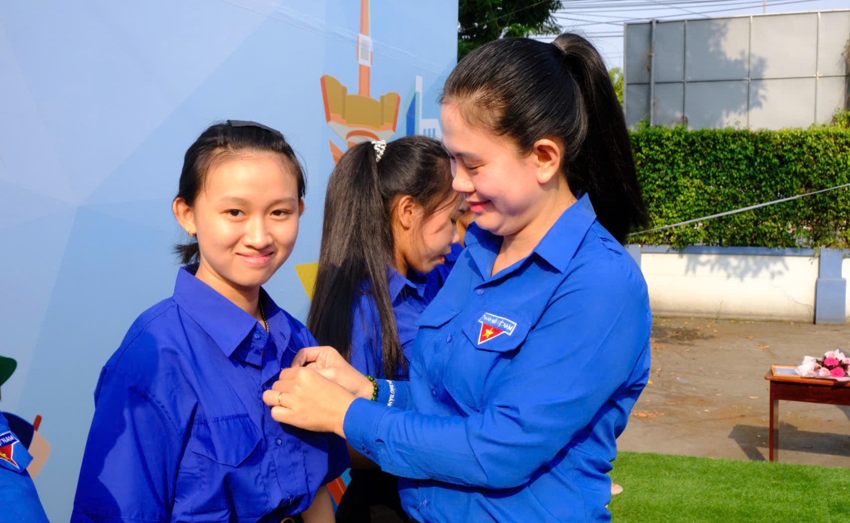 Đồng chí Trần Thị Diễm Trinh trao huy hiệu đoàn cho các đoàn viên mới được kết nạp