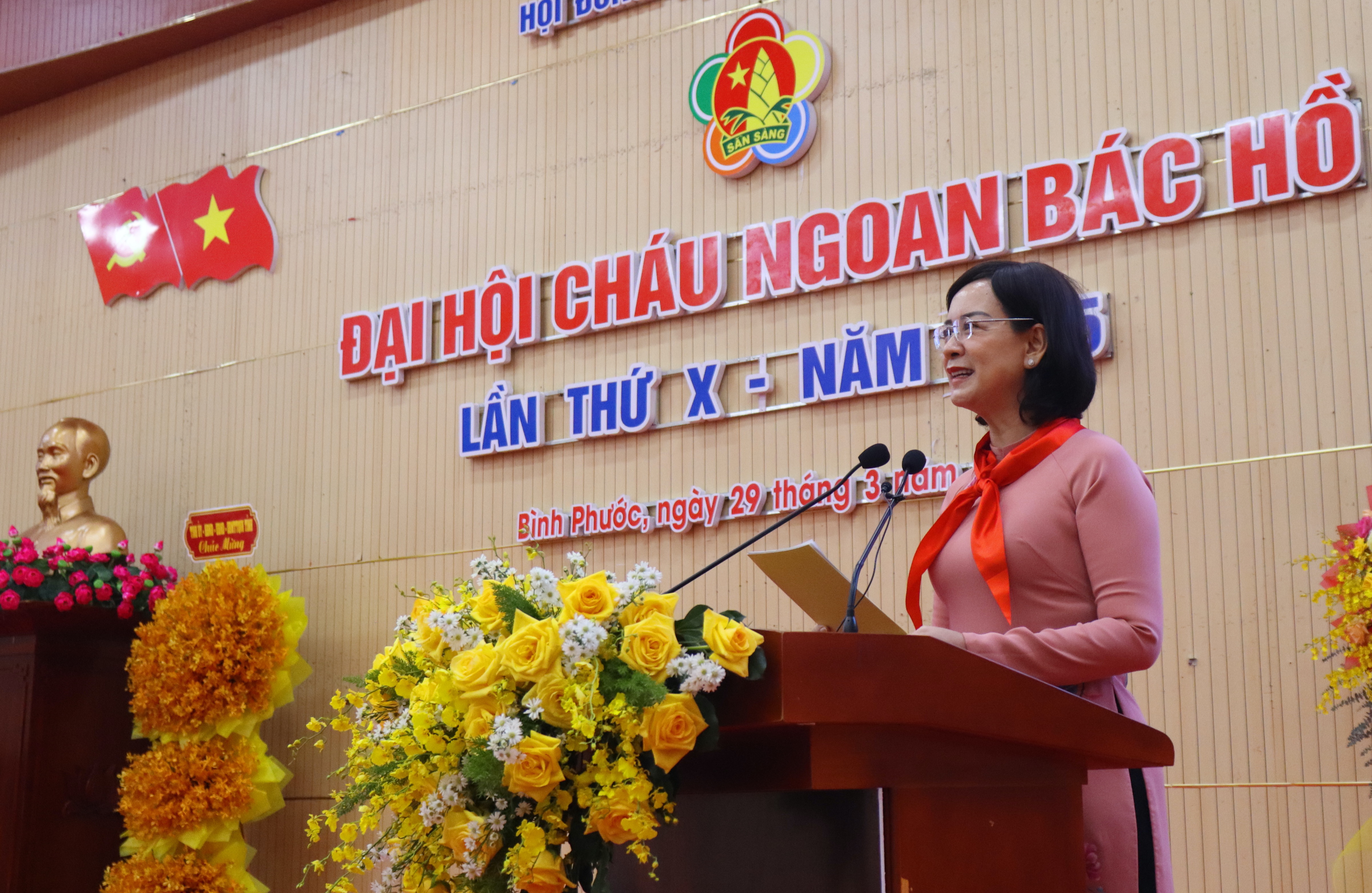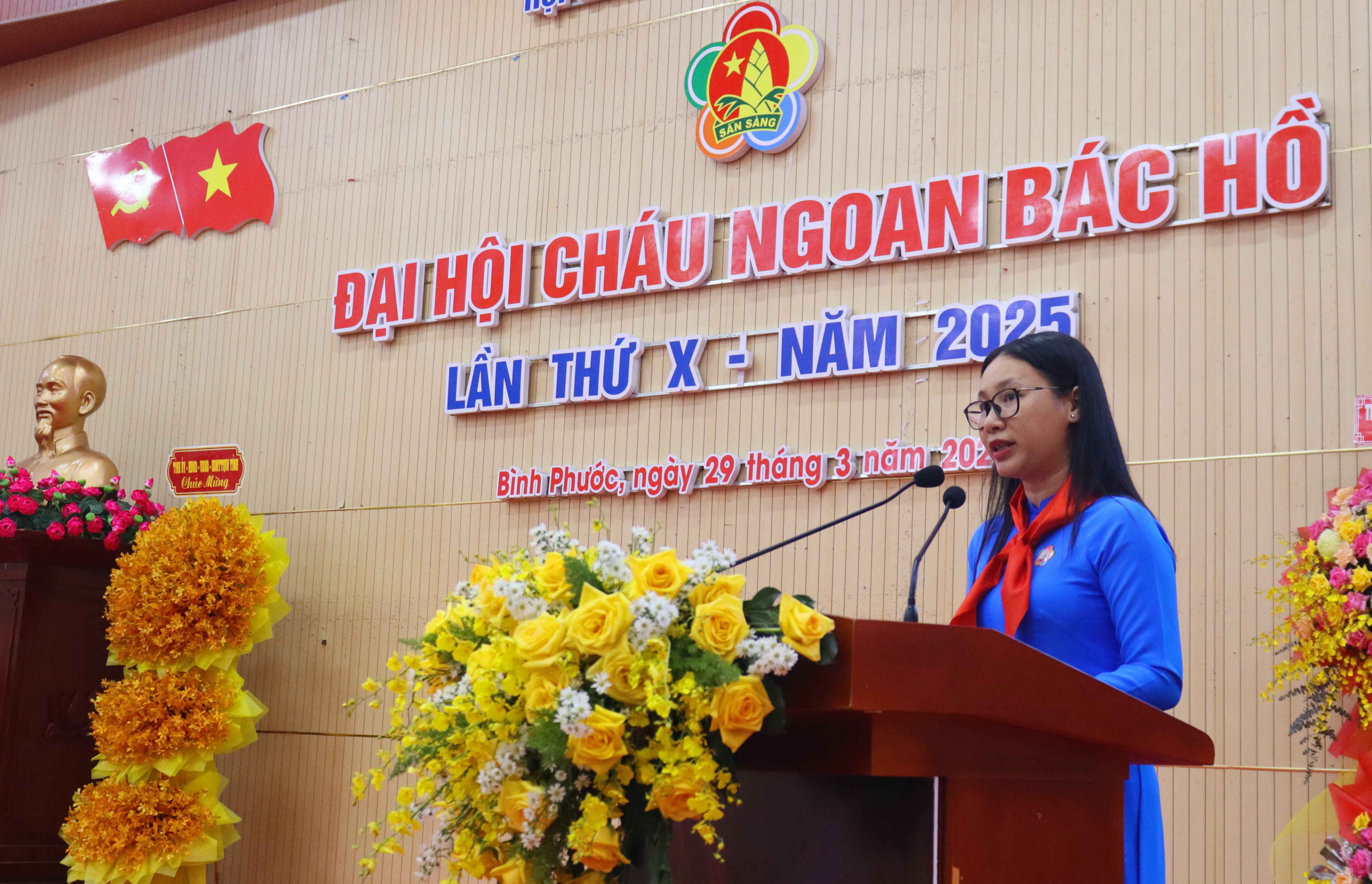 Phát biểu khai mạc đại hội, đồng chí Lê Thị Hồng Phấn, Phó Bí thư Tỉnh đoàn, Chủ tịch Hội đồng Đội tỉnh ghi nhận mỗi bạn thiếu nhi được tuyên dương hôm nay đều có những thành tích xuất sắc, đáng tự hào trong thực hiện phong trào “Thiếu nhi Bình Phước thi đua làm theo 5 điều Bác Hồ dạy”, cùng nhau tạo nên vườn hoa đẹp với những tấm gương sáng, những câu chuyện hay dâng lên Đảng và Bác Hồ kính yêu. Để đền đáp lại những sự quan tâm, tạo điều kiện tốt nhất của các đồng chí lãnh đạo, các cơ quan, đơn vị cho thế hệ trẻ hôm nay, thiếu nhi Bình Phước sẽ luôn ghi nhớ lời dạy của Bác để ra sức học tập, rèn luyện, góp sức xây dựng quê hương đất nước giàu mạnh, văn minh.