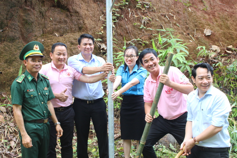 Các đại biểu đã tham gia cùng cán bộ, chiến sĩ Đồn biên phòng Đắc Ơ hoàn thành lắp đặt những trụ đèn còn lại của công trình Ánh sáng biên cương.