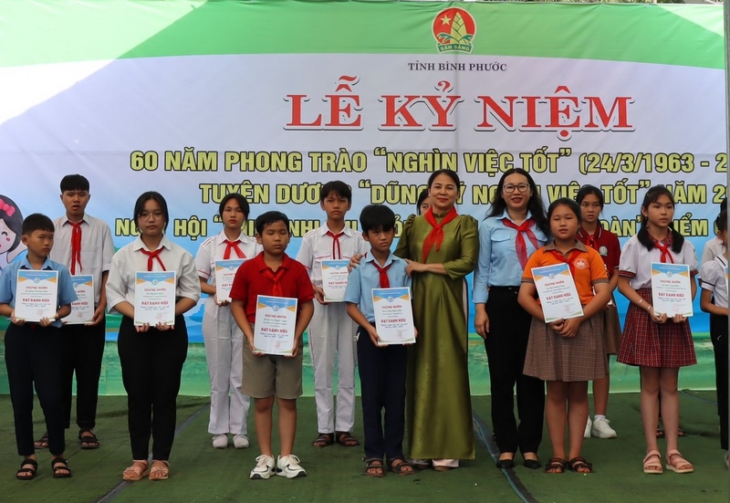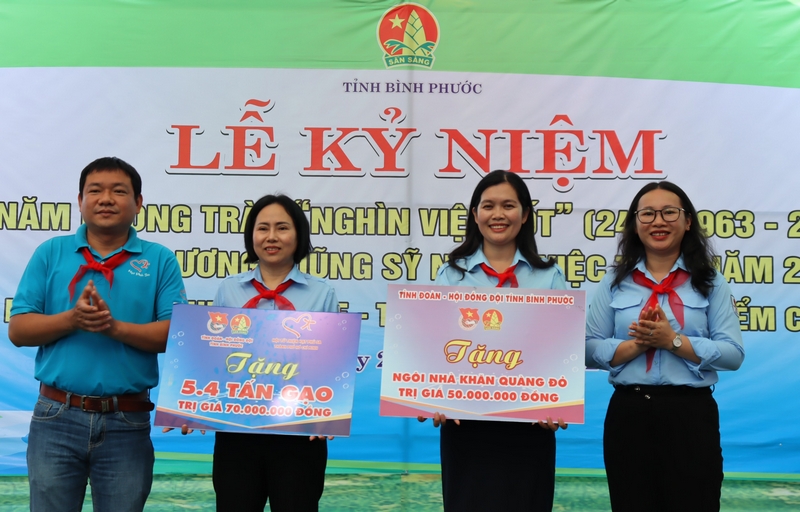 Cũng tại chương trình, Hội đồng Đội tỉnh đã trao giấy chứng nhận và tuyên dương 263 gương “Dũng sĩ Nghìn việc tốt” cấp tỉnh cho các em đội viên, thiếu niên, nhi đồng và các tập thể xuất sắc tiêu biểu trong thực hiện phong trào “Nghìn việc tốt” trên địa tỉnh; trao tặng quà cho 100 em học sinh vượt khó học tốt đang học tập tại 2 trường Phổ thông Dân tộc nội trú THCS-THPT Điểu Ong và trường Tiểu học Lê Lợi, huyện Bù Đăng.