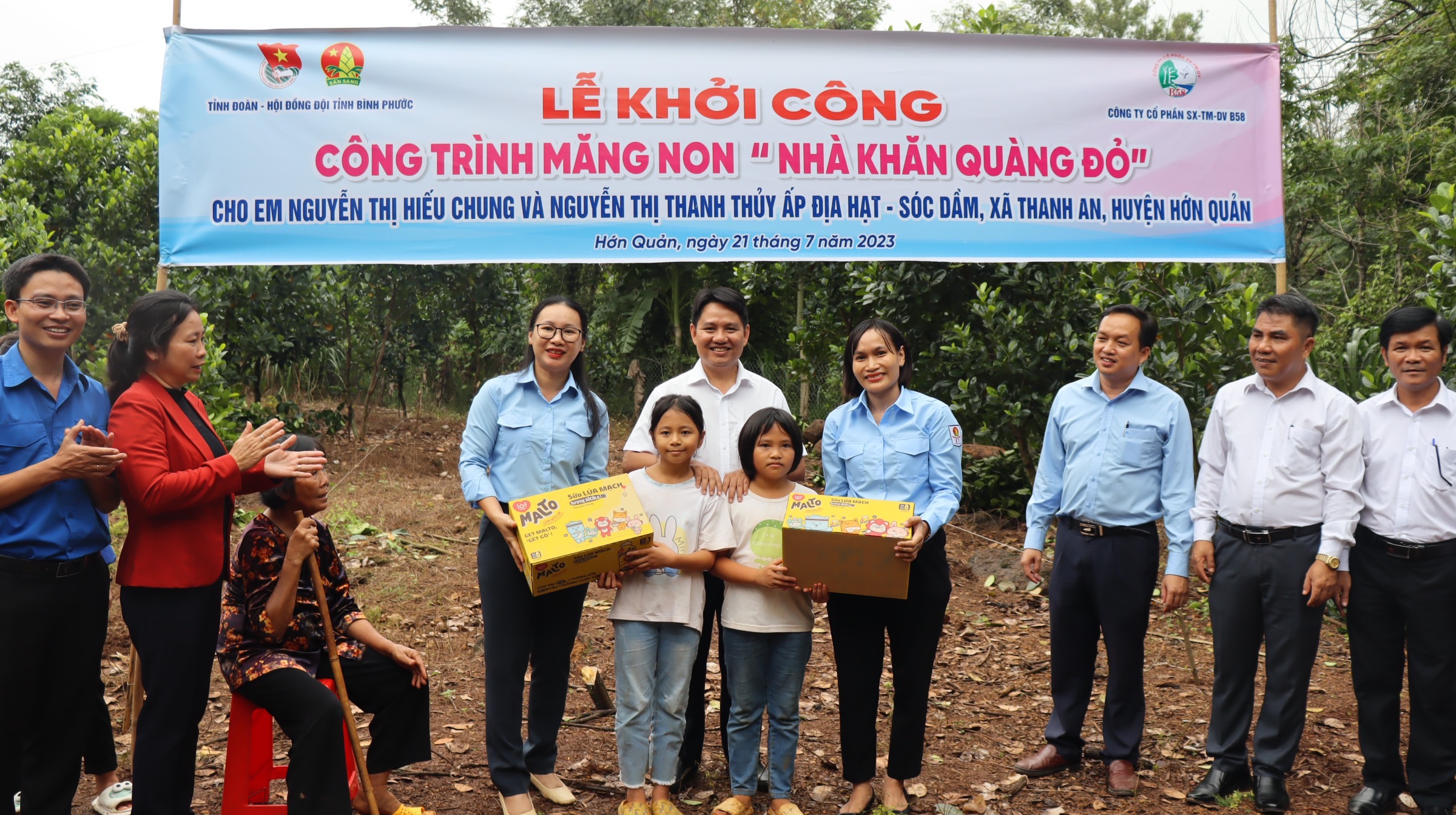 Ngôi nhà “Khăn quàng đỏ” được khởi công xây dựng cho 02 em đội viên là Nguyễn Thị Hiếu Chung, học sinh lớp 5 và Nguyễn Thị Thanh Thủy, học sinh lớp 4, Trường Tiểu học Thanh An, huyện Hớn Quản.
