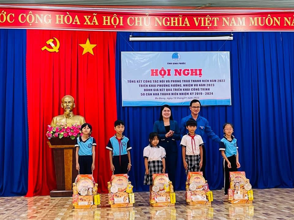 Đồng chí Lê Thị Hồng Phấn - Phó Bí thư Tỉnh Đoàn, Chủ tịch Hội đồng Đội tỉnh Bình Phước và đồng chí Trần Thị Diễm Trinh - Bí thư Tỉnh Đoàn Bình Dương trao các phần quà đến các em thiếu nhi vượt khó học tốt tại huyện Lộc Ninh, tỉnh Bình Phước