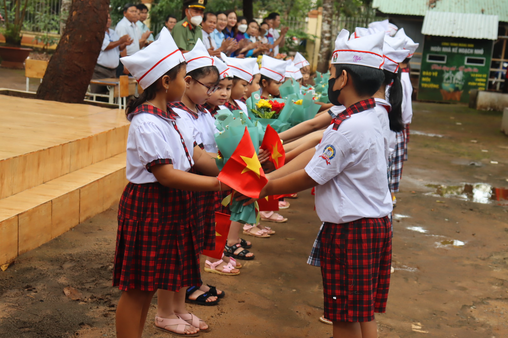 Các em học sinh trao hoa và chào đón 245 học sinh vào lớp 1 của trường tại Lễ khai giảng phát động chủ đề công tác Đội và phong trào thiếu nhi năm học 2022 - 2023 điểm cấp tỉnh.