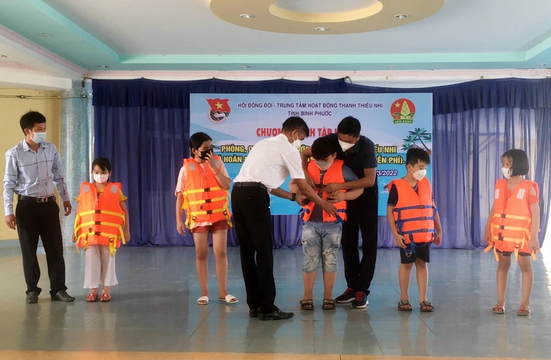 Các em học sinh được thực hành các mặc áo phao bơi an toàn đúng cách