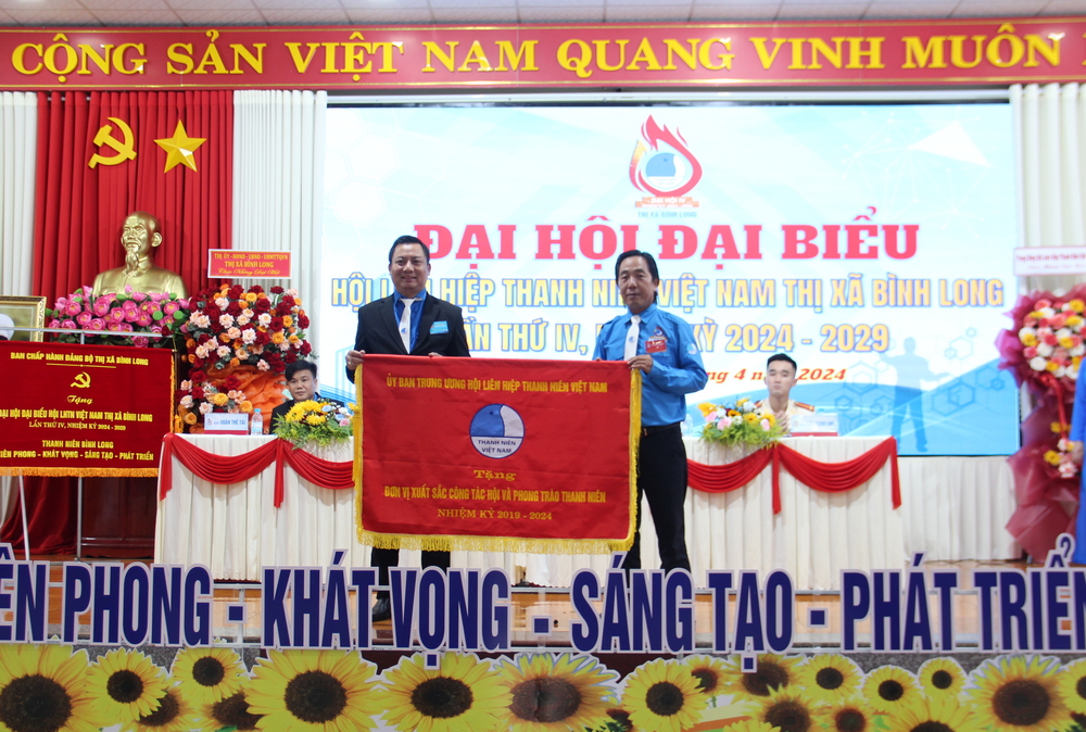 Anh Trần Thanh Bình - Thường trực Văn phòng Trung ương Hội LHTN Việt Nam phía Nam trao cờ đơn vị xuất sắc cho Hội LHTN Việt Nam thị xã Bình Long.