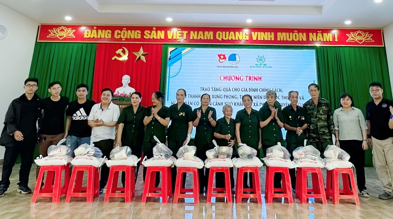 Đồng chí Nguyễn Trọng Lâm - Phó Bí thư Tỉnh Đoàn, Chủ tịch Hội LHTN Việt Nam trao tặng các phần quà cho các hộ dân, giáo viên, thanh thiếu nhi có hoàn cảnh khó khăn