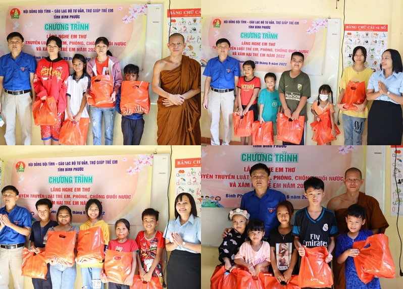 Sáng ngày 20/6 Hội đồng Đội tỉnh, Câu lạc bộ tư vấn, trợ giúp trẻ em tỉnh phối hợp với chùa Sreyvonsa (thành phố Đồng Xoài) tổ chức chương trình “Lắng nghe em thơ” tuyên truyền Luật trẻ em, phòng, chống đuối nước và xâm hại trẻ em với sự tham gia của 20 em thiếu nhi đang học tập tại lớp tình thương.