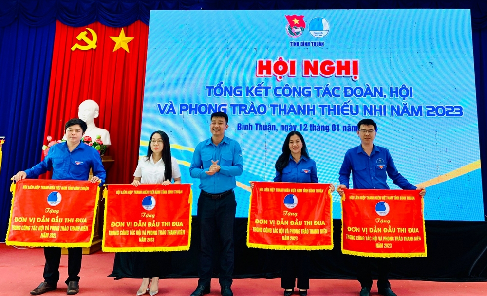 Đồng chí Trương Minh Quang - Bí thư Tỉnh đoàn Bình Thuận tặng cờ thi đua công tác Đoàn cho các đơn vị xuất sắc