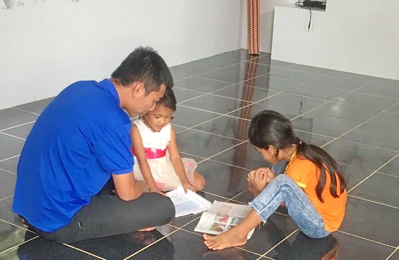 Thanh niên tình nguyện hướng dẫn các em nhỏ ôn bài